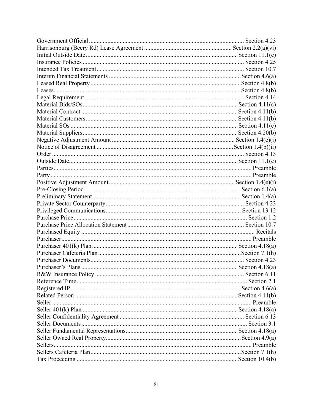 81 Government Official ..................................................................................................... Section 4.23 Harrisonburg (Beery Rd) Lease Agreement ......................................................... Section 2.2(a)(vi) Initial Outside Date ................................................................................................... Section 11.1(c) Insurance Policies ......................................................................................................... Section 4.25 Intended Tax Treatment ................................................................................................ Section 10.7 Interim Financial Statements ...................................................................................... Section 4.6(a) Leased Real Property .................................................................................................. Section 4.8(b) Leases .......................................................................................................................... Section 4.8(b) Legal Requirement ........................................................................................................ Section 4.14 Material Bids/SOs ..................................................................................................... Section 4.11(c) Material Contract ...................................................................................................... Section 4.11(b) Material Customers ................................................................................................... Section 4.11(b) Material SOs ............................................................................................................. Section 4.11(c) Material Suppliers ..................................................................................................... Section 4.20(b) Negative Adjustment Amount ................................................................................ Section 1.4(e)(i) Notice of Disagreement ......................................................................................... Section 1.4(b)(ii) Order ............................................................................................................................. Section 4.13 Outside Date.............................................................................................................. Section 11.1(c) Parties ................................................................................................................................. Preamble Party ................................................................................................................................... Preamble Positive Adjustment Amount .................................................................................. Section 1.4(e)(i) Pre-Closing Period ...................................................................................................... Section 6.1(a) Preliminary Statement ................................................................................................. Section 1.4(a) Private Sector Counterparty .......................................................................................... Section 4.23 Privileged Communications ........................................................................................ Section 13.12 Purchase Price ................................................................................................................. Section 1.2 Purchase Price Allocation Statement ............................................................................ Section 10.7 Purchased Equity ................................................................................................................. Recitals Purchaser ............................................................................................................................ Preamble Purchaser 401(k) Plan ............................................................................................... Section 4.18(a) Purchaser Cafeteria Plan ............................................................................................. Section 7.1(h) Purchaser Documents .................................................................................................... Section 4.23 Purchaser’s Plans ...................................................................................................... Section 4.18(a) R&W Insurance Policy ................................................................................................. Section 6.11 Reference Time ............................................................................................................... Section 2.1 Registered IP ............................................................................................................... Section 4.6(a) Related Person .......................................................................................................... Section 4.11(b) Seller .................................................................................................................................. Preamble Seller 401(k) Plan ..................................................................................................... Section 4.18(a) Seller Confidentiality Agreement ................................................................................. Section 6.13 Seller Documents ............................................................................................................ Section 3.1 Seller Fundamental Representations ......................................................................... Section 4.18(a) Seller Owned Real Property ........................................................................................ Section 4.9(a) Sellers ................................................................................................................................. Preamble Sellers Cafete