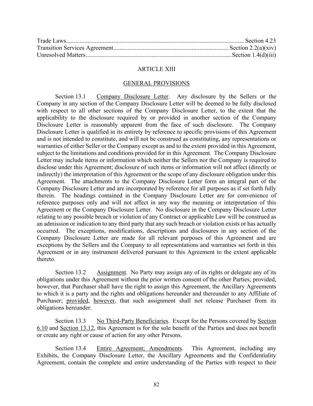 82 Trade Laws .................................................................................................................... Section 4.23 Transition Services Agreement ........................................................................... Section 2.2(a)(xiv) Unresolved Matters ............................................................................................... Section 1.4(d)(iii) ARTICLE XIII GENERAL PROVISIONS Section 13.1 Company Disclosure Letter. Any disclosure by the Sellers or the Company in any section of the Company Disclosure Letter will be deemed to be fully disclosed with respect to all other sections of the Company Disclosure Letter, to the extent that the applicability to the disclosure required by or provided in another section of the Company Disclosure Letter is reasonably apparent from the face of such disclosure. The Company Disclosure Letter is qualified in its entirety by reference to specific provisions of this Agreement and is not intended to constitute, and will not be construed as constituting, any representations or warranties of either Seller or the Company except as and to the extent provided in this Agreement, subject to the limitations and conditions provided for in this Agreement. The Company Disclosure Letter may include items or information which neither the Sellers nor the Company is required to disclose under this Agreement; disclosure of such items or information will not affect (directly or indirectly) the interpretation of this Agreement or the scope of any disclosure obligation under this Agreement. The attachments to the Company Disclosure Letter form an integral part of the Company Disclosure Letter and are incorporated by reference for all purposes as if set forth fully therein. The headings contained in the Company Disclosure Letter are for convenience of reference purposes only and will not affect in any way the meaning or interpretation of this Agreement or the Company Disclosure Letter. No disclosure in the Company Disclosure Letter relating to any possible breach or violation of any Contract or applicable Law will be construed as an admission or indication to any third party that any such breach or violation exists or has actually occurred. The exceptions, modifications, descriptions and disclosures in any section of the Company Disclosure Letter are made for all relevant purposes of this Agreement and are exceptions by the Sellers and the Company to all representations and warranties set forth in this Agreement or in any instrument delivered pursuant to this Agreement to the extent applicable thereto. Section 13.2 Assignment. No Party may assign any of its rights or delegate any of its obligations under this Agreement without the prior written consent of the other Parties; provided, however, that Purchaser shall have the right to assign this Agreement, the Ancillary Agreements to which it is a party and the rights and obligations hereunder and thereunder to any Affiliate of Purchaser; provided, however, that such assignment shall not release Purchaser from its obligations hereunder. Section 13.3 No Third-Party Beneficiaries. Except for the Persons covered by Section 6.10 and Section 13.12, this Agreement is for the sole benefit of the Parties and does not benefit or create any right or cause of action for any other Persons. Section 13.4 Entire Agreement; Amendments. This Agreement, including any Exhibits, the Company Disclosure Letter, the Ancillary Agreements and the Confidentiality Agreement, contain the complete and entire understanding of the Parties with respect to their