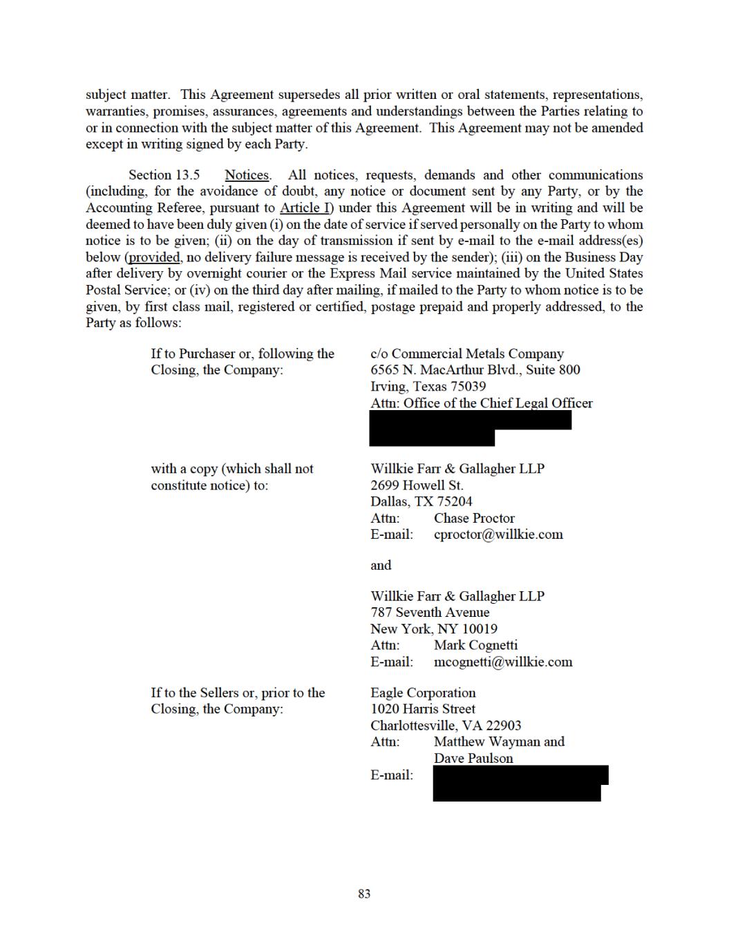 5 EQUITY PURCHASE AGREEMENT This EQUITY PURCHASE AGREEMENT (this “Agreement”), dated as of September 17, 2025 (the “Effective Date”), is by and among Commercial Metals Company, a Delaware corporation (“Purchaser”), Concrete Pipe & Precast, LLC, a Delaware limited liability company (the “Company”), Eagle Corporation, a Virginia corporation (“Eagle”), and ECPP, LLC, a Virginia limited liability company (“ECPP”, and together with Eagle, each a “Seller” and collectively the “Sellers”). Purchaser, the Company and the Sellers are each sometimes referred to herein as a “Party” or collectively as the “Parties”. RECITALS: 1. The Sellers collectively own all of the issued and outstanding Equity Securities of the Company (the “Purchased Equity”). 2. On the terms and subject to the conditions of this Agreement, Purchaser desires to purchase the Purchased Equity from the Sellers, and the Sellers desire to sell the Purchased Equity to Purchaser. Accordingly, the Parties agree as follows: ARTICLE I PURCHASE AND SALE OF PURCHASED EQUITY Section 1.1 Purchase and Sale. On the terms and subject to the conditions of this Agreement, at the Closing, the Sellers will sell, assign, transfer, convey and deliver to Purchaser, and Purchaser will purchase, acquire and accept from the Sellers, all right, title and interest in and to the Purchased Equity, free and clear of all Encumbrances other than those imposed by federal or state securities Laws. Section 1.2 Amount and Form of Purchase Price. The aggregate purchase price to be paid to the Sellers in consideration of the Purchased Equity will be $675,000,000 in cash, plus the Estimated Closing Adjustment (if positive) or minus the absolute value of the Estimated Closing Adjustment (if negative), minus the Escrow Fund (the resulting calculation of the foregoing, the “Closing Payment”), subject to the adjustments set forth in Section 1.4 (the Closing Payment, as so adjusted, the “Purchase Price”). Section 1.3 Estimated Closing Adjustment Statement; Closing Payment. (a) Not later than three Business Days prior to the Closing Date, the Sellers (or their respective Representatives) will deliver to Purchaser a statement (the “Estimated Closing Adjustment Statement”) setting forth its good faith estimates, together with reasonably detailed supporting documentation, of (i) Closing Net Working Capital, Indebtedness, Cash and Transaction Expenses and (ii) the Closing Adjustment based thereon. The estimate of the amount of the Closing Adjustment, as set forth in the Estimated Closing Adjustment Statement, is referred to herein as the “Estimated Closing Adjustment.” The Estimated Closing Adjustment Statement, and the component items thereof, will be prepared in accordance with the Accounting Principles.