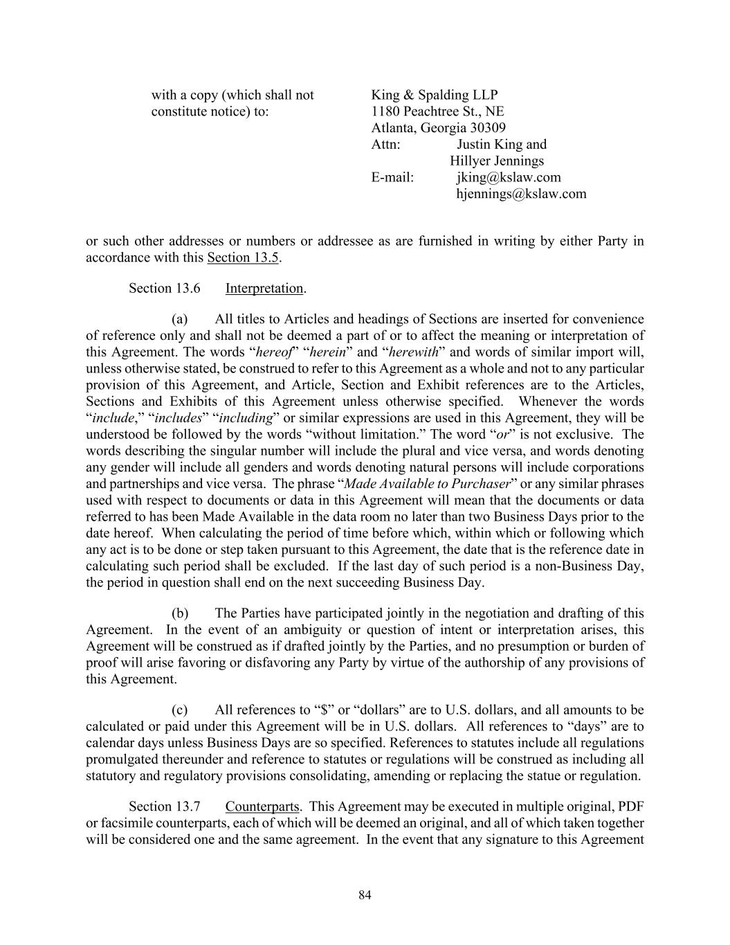 84 with a copy (which shall not constitute notice) to: King & Spalding LLP 1180 Peachtree St., NE Atlanta, Georgia 30309 Attn: Justin King and Hillyer Jennings E-mail: jking@kslaw.com hjennings@kslaw.com or such other addresses or numbers or addressee as are furnished in writing by either Party in accordance with this Section 13.5. Section 13.6 Interpretation. (a) All titles to Articles and headings of Sections are inserted for convenience of reference only and shall not be deemed a part of or to affect the meaning or interpretation of this Agreement. The words “hereof” “herein” and “herewith” and words of similar import will, unless otherwise stated, be construed to refer to this Agreement as a whole and not to any particular provision of this Agreement, and Article, Section and Exhibit references are to the Articles, Sections and Exhibits of this Agreement unless otherwise specified. Whenever the words “include,” “includes” “including” or similar expressions are used in this Agreement, they will be understood be followed by the words “without limitation.” The word “or” is not exclusive. The words describing the singular number will include the plural and vice versa, and words denoting any gender will include all genders and words denoting natural persons will include corporations and partnerships and vice versa. The phrase “Made Available to Purchaser” or any similar phrases used with respect to documents or data in this Agreement will mean that the documents or data referred to has been Made Available in the data room no later than two Business Days prior to the date hereof. When calculating the period of time before which, within which or following which any act is to be done or step taken pursuant to this Agreement, the date that is the reference date in calculating such period shall be excluded. If the last day of such period is a non-Business Day, the period in question shall end on the next succeeding Business Day. (b) The Parties have participated jointly in the negotiation and drafting of this Agreement. In the event of an ambiguity or question of intent or interpretation arises, this Agreement will be construed as if drafted jointly by the Parties, and no presumption or burden of proof will arise favoring or disfavoring any Party by virtue of the authorship of any provisions of this Agreement. (c) All references to “$” or “dollars” are to U.S. dollars, and all amounts to be calculated or paid under this Agreement will be in U.S. dollars. All references to “days” are to calendar days unless Business Days are so specified. References to statutes include all regulations promulgated thereunder and reference to statutes or regulations will be construed as including all statutory and regulatory provisions consolidating, amending or replacing the statue or regulation. Section 13.7 Counterparts. This Agreement may be executed in multiple original, PDF or facsimile counterparts, each of which will be deemed an original, and all of which taken together will be considered one and the same agreement. In the event that any signature to this Agreement