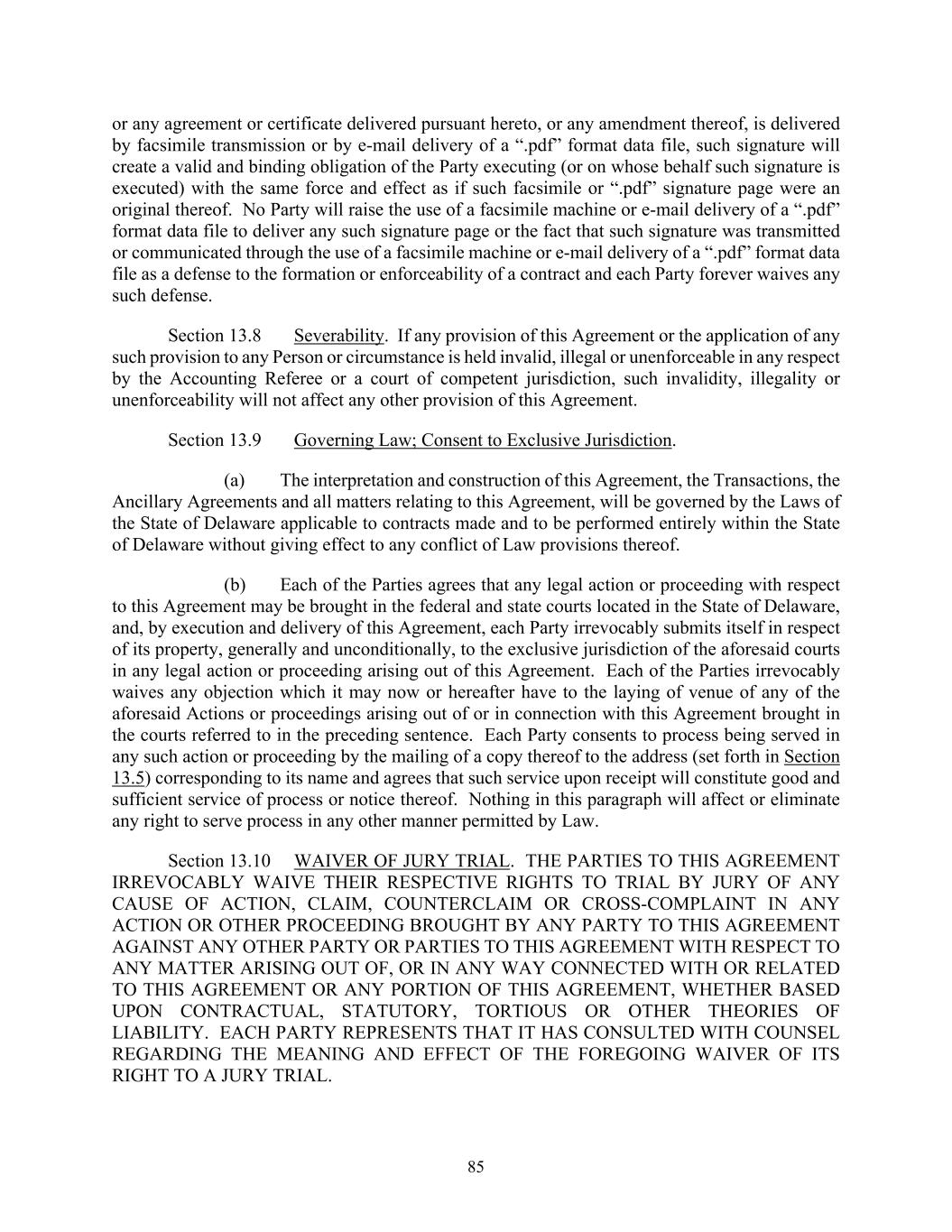 85 or any agreement or certificate delivered pursuant hereto, or any amendment thereof, is delivered by facsimile transmission or by e-mail delivery of a “.pdf” format data file, such signature will create a valid and binding obligation of the Party executing (or on whose behalf such signature is executed) with the same force and effect as if such facsimile or “.pdf” signature page were an original thereof. No Party will raise the use of a facsimile machine or e-mail delivery of a “.pdf” format data file to deliver any such signature page or the fact that such signature was transmitted or communicated through the use of a facsimile machine or e-mail delivery of a “.pdf” format data file as a defense to the formation or enforceability of a contract and each Party forever waives any such defense. Section 13.8 Severability. If any provision of this Agreement or the application of any such provision to any Person or circumstance is held invalid, illegal or unenforceable in any respect by the Accounting Referee or a court of competent jurisdiction, such invalidity, illegality or unenforceability will not affect any other provision of this Agreement. Section 13.9 Governing Law; Consent to Exclusive Jurisdiction. (a) The interpretation and construction of this Agreement, the Transactions, the Ancillary Agreements and all matters relating to this Agreement, will be governed by the Laws of the State of Delaware applicable to contracts made and to be performed entirely within the State of Delaware without giving effect to any conflict of Law provisions thereof. (b) Each of the Parties agrees that any legal action or proceeding with respect to this Agreement may be brought in the federal and state courts located in the State of Delaware, and, by execution and delivery of this Agreement, each Party irrevocably submits itself in respect of its property, generally and unconditionally, to the exclusive jurisdiction of the aforesaid courts in any legal action or proceeding arising out of this Agreement. Each of the Parties irrevocably waives any objection which it may now or hereafter have to the laying of venue of any of the aforesaid Actions or proceedings arising out of or in connection with this Agreement brought in the courts referred to in the preceding sentence. Each Party consents to process being served in any such action or proceeding by the mailing of a copy thereof to the address (set forth in Section 13.5) corresponding to its name and agrees that such service upon receipt will constitute good and sufficient service of process or notice thereof. Nothing in this paragraph will affect or eliminate any right to serve process in any other manner permitted by Law. Section 13.10 WAIVER OF JURY TRIAL. THE PARTIES TO THIS AGREEMENT IRREVOCABLY WAIVE THEIR RESPECTIVE RIGHTS TO TRIAL BY JURY OF ANY CAUSE OF ACTION, CLAIM, COUNTERCLAIM OR CROSS-COMPLAINT IN ANY ACTION OR OTHER PROCEEDING BROUGHT BY ANY PARTY TO THIS AGREEMENT AGAINST ANY OTHER PARTY OR PARTIES TO THIS AGREEMENT WITH RESPECT TO ANY MATTER ARISING OUT OF, OR IN ANY WAY CONNECTED WITH OR RELATED TO THIS AGREEMENT OR ANY PORTION OF THIS AGREEMENT, WHETHER BASED UPON CONTRACTUAL, STATUTORY, TORTIOUS OR OTHER THEORIES OF LIABILITY. EACH PARTY REPRESENTS THAT IT HAS CONSULTED WITH COUNSEL REGARDING THE MEANING AND EFFECT OF THE FOREGOING WAIVER OF ITS RIGHT TO A JURY TRIAL.