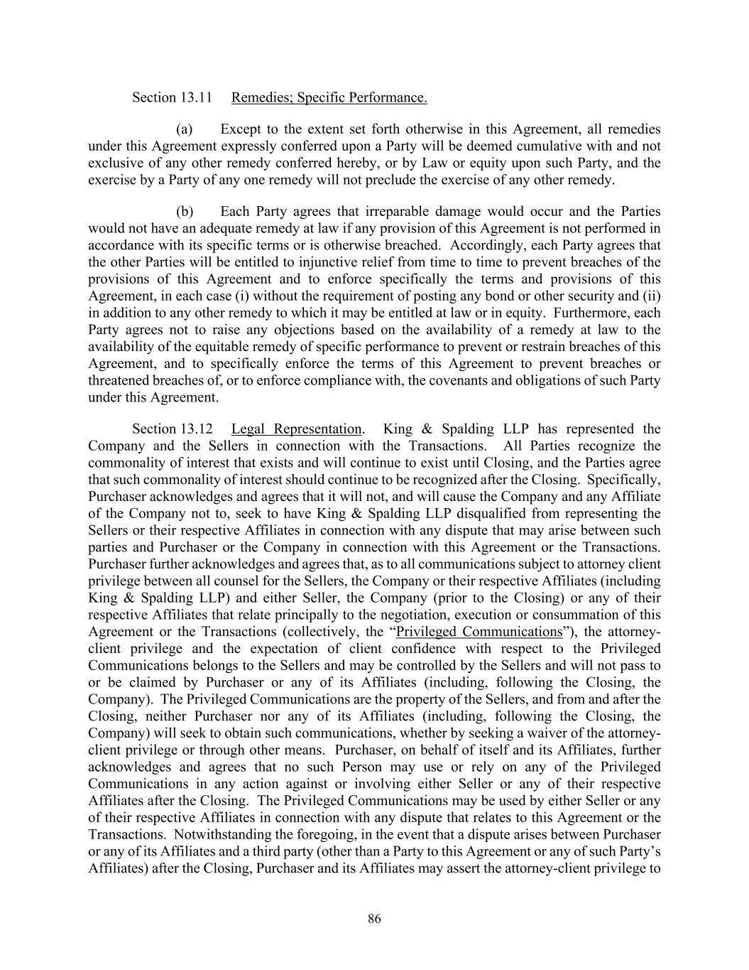 86 Section 13.11 Remedies; Specific Performance. (a) Except to the extent set forth otherwise in this Agreement, all remedies under this Agreement expressly conferred upon a Party will be deemed cumulative with and not exclusive of any other remedy conferred hereby, or by Law or equity upon such Party, and the exercise by a Party of any one remedy will not preclude the exercise of any other remedy. (b) Each Party agrees that irreparable damage would occur and the Parties would not have an adequate remedy at law if any provision of this Agreement is not performed in accordance with its specific terms or is otherwise breached. Accordingly, each Party agrees that the other Parties will be entitled to injunctive relief from time to time to prevent breaches of the provisions of this Agreement and to enforce specifically the terms and provisions of this Agreement, in each case (i) without the requirement of posting any bond or other security and (ii) in addition to any other remedy to which it may be entitled at law or in equity. Furthermore, each Party agrees not to raise any objections based on the availability of a remedy at law to the availability of the equitable remedy of specific performance to prevent or restrain breaches of this Agreement, and to specifically enforce the terms of this Agreement to prevent breaches or threatened breaches of, or to enforce compliance with, the covenants and obligations of such Party under this Agreement. Section 13.12 Legal Representation. King & Spalding LLP has represented the Company and the Sellers in connection with the Transactions. All Parties recognize the commonality of interest that exists and will continue to exist until Closing, and the Parties agree that such commonality of interest should continue to be recognized after the Closing. Specifically, Purchaser acknowledges and agrees that it will not, and will cause the Company and any Affiliate of the Company not to, seek to have King & Spalding LLP disqualified from representing the Sellers or their respective Affiliates in connection with any dispute that may arise between such parties and Purchaser or the Company in connection with this Agreement or the Transactions. Purchaser further acknowledges and agrees that, as to all communications subject to attorney client privilege between all counsel for the Sellers, the Company or their respective Affiliates (including King & Spalding LLP) and either Seller, the Company (prior to the Closing) or any of their respective Affiliates that relate principally to the negotiation, execution or consummation of this Agreement or the Transactions (collectively, the “Privileged Communications”), the attorney- client privilege and the expectation of client confidence with respect to the Privileged Communications belongs to the Sellers and may be controlled by the Sellers and will not pass to or be claimed by Purchaser or any of its Affiliates (including, following the Closing, the Company). The Privileged Communications are the property of the Sellers, and from and after the Closing, neither Purchaser nor any of its Affiliates (including, following the Closing, the Company) will seek to obtain such communications, whether by seeking a waiver of the attorney- client privilege or through other means. Purchaser, on behalf of itself and its Affiliates, further acknowledges and agrees that no such Person may use or rely on any of the Privileged Communications in any action against or involving either Seller or any of their respective Affiliates after the Closing. The Privileged Communications may be used by either Seller or any of their respective Affiliates in connection with any dispute that relates to this Agreement or the Transactions. Notwithstanding the foregoing, in the event that a dispute arises between Purchaser or any of its Affiliates and a third party (other than a Party to this Agreement or any of such Party’s Affiliates) after the Closing, Purchaser and its Affiliates may assert the attorney-client privilege to