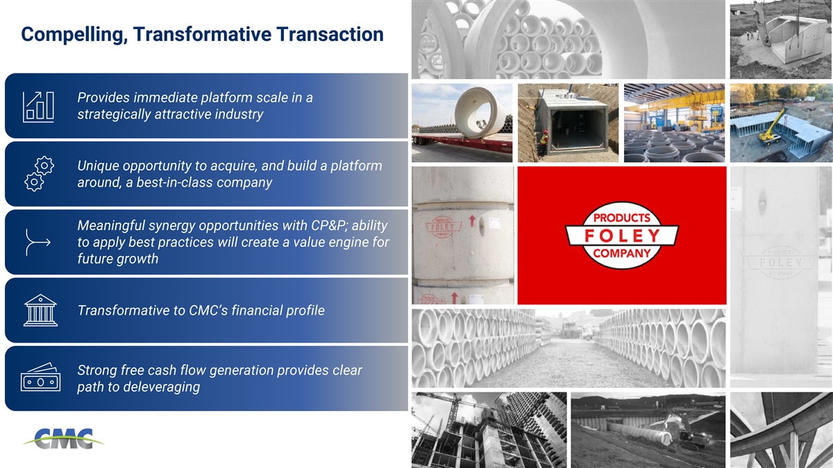 Compelling, Transformative Transaction Provides immediate platform scale in a strategically attractive industry Unique opportunity to acquire, and build a platform around, a best-in-class company Meaningful synergy opportunities with CP&P; ability to apply best practices will create a value engine for future growth Transformative to CMC’s financial profile Strong free cash flow generation provides clear path to deleveraging