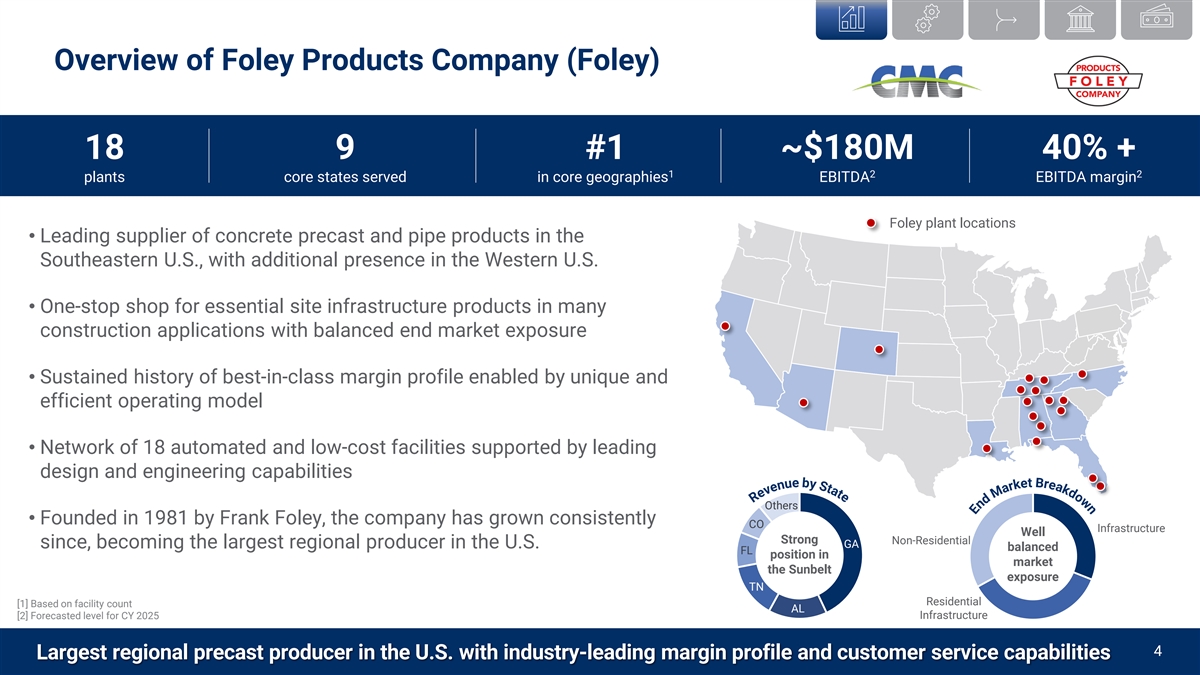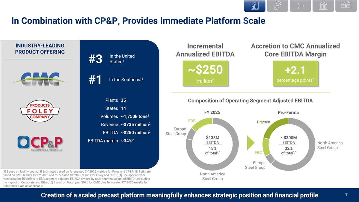 In Combination with CP&P, Provides Immediate Platform Scale INDUSTRY-LEADING Incremental Accretion to CMC Annualized PRODUCT OFFERING Annualized EBITDA Core EBITDA Margin In the United 1 #3 States ~$250 +2.1 1 3 In the Southeast 2 percentage points million #1 Plants 35 Composition of Operating Segment Adjusted EBITDA States 14 FY 2025 Pro-Forma 2 Volumes ~1,750k tons EBG Precast 2 Revenue ~$735 million Europe 2 EBITDA ~$250 million Steel Group $138M ~$390M 2 EBITDA margin ~34% EBITDA EBITDA North America Steel Group 15% 32% 4,5 5,6 EBG of total of total Europe Steel Group [1] Based on facility count; [2] Estimated based on forecasted CY 2025 metrics for Foley and CP&P; [3] Estimate North America based on CMC results for FY 2025 and forecasted CY 2025 results for Foley and CP&P; [4] See appendix for reconciliation; [5] Refers to EBG segment adjusted EBITDA divided by total segment adjusted EBITDA excluding Steel Group the impact of Corporate and Other; [6] Based on fiscal year 2025 for CMC plus forecasted CY 2025 results for Foley and CP&P, as applicable CMC Acquires X 7 Creation of a scaled precast platform meaningfully enhances strategic position and financial profile