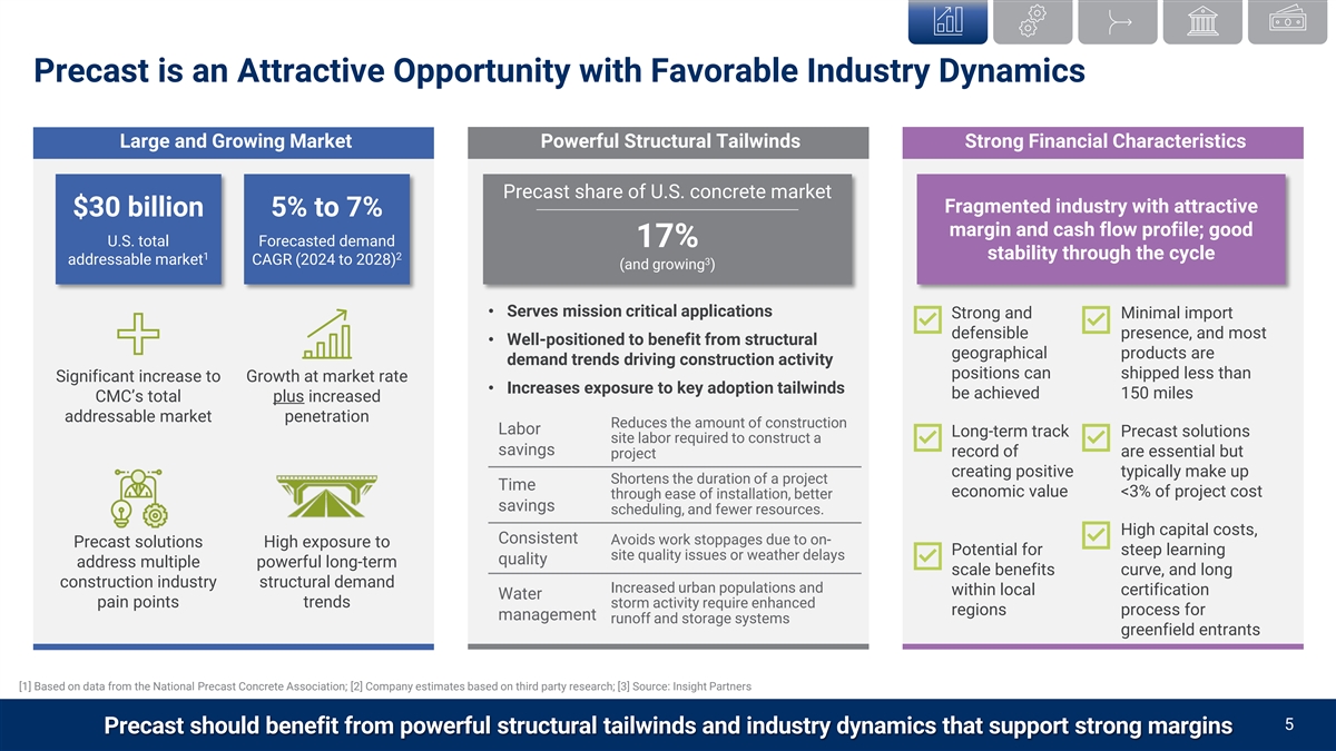 Precast is an Attractive Opportunity with Favorable Industry Dynamics Large and Growing Market Powerful Structural Tailwinds Strong Financial Characteristics Precast share of U.S. concrete market Fragmented industry with attractive $30 billion 5% to 7% margin and cash flow profile; good U.S. total Forecasted demand 17% 1 2 stability through the cycle addressable market CAGR (2024 to 2028) 3 (and growing ) • Serves mission critical applications Strong and Minimal import defensible presence, and most • Well-positioned to benefit from structural geographical products are demand trends driving construction activity positions can shipped less than Significant increase to Growth at market rate • Increases exposure to key adoption tailwinds be achieved 150 miles CMC’s total plus increased addressable market penetration Reduces the amount of construction Labor Long-term track Precast solutions site labor required to construct a savings record of are essential but project creating positive typically make up Shortens the duration of a project Time economic value <3% of project cost through ease of installation, better savings scheduling, and fewer resources. High capital costs, Consistent Avoids work stoppages due to on- Precast solutions High exposure to Potential for steep learning site quality issues or weather delays quality address multiple powerful long-term scale benefits curve, and long construction industry structural demand Increased urban populations and within local certification Water pain points trends storm activity require enhanced regions process for management runoff and storage systems greenfield entrants [1] Based on data from the National Precast Concrete Association; [2] Company estimates based on third party research; [3] Source: Insight Partners CMC Acquires X 5 Precast should benefit from powerful structural tailwinds and industry dynamics that support strong margins