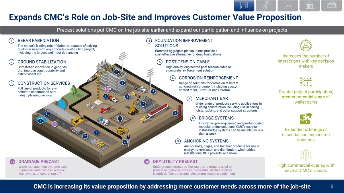 Expands CMC’s Role on Job-Site and Improves Customer Value Proposition Precast solutions put CMC on the job-site earlier and expand our participation and influence on projects 1 4 REBAR FABRICATION FOUNDATION IMPROVEMENT The nation’s leading rebar fabricator, capable of solving SOLUTIONS customer needs on any concrete construction project, Rammed aggregate pier solutions provide a including the largest and most demanding cost-effective alternative for deep foundations Increases the number of interactions with key decision 2 5 GROUND STABILIZATION POST TENSION CABLE makers Unmatched innovation in geogrids High-quality, engineered post tension cable as a concrete reinforcement solution that improve constructability and 5 extend asset life 6 CORROSION REINFORCEMENT 1 3 Range of solutions for corrosion resistant CONSTRUCTION SERVICES concrete reinforcement, including epoxy- Full line of products for any 10 coated rebar, GalvaBar and ChromX 9 concrete construction site; Greater project participation; industry-leading service 3 2 greater potential share of 7 MERCHANT BAR wallet gains Wide range of products serving applications in 7 building construction including use in ceiling joists, racking, and other support structures 9 8 1 8 BRIDGE SYSTEMS 6 Innovative, pre-engineered and pre-fabricated 11 modular bridge solutions. CMC’s easy-to- install bridge systems can be installed in less Expanded offerings of 1 than a week essential and engineered 2 solutions 9 ANCHORING SYSTEMS 4 Anchor bolts, cages, and fastener products for use in energy transmission and distribution, wind turbine installations, DOT projects, and more 11 10 DRAINAGE PRECAST DRY UTILITY PRECAST High commercial overlap with Water management systems used Underground structures like vaults and troughs used to to provide water access, remove protect and provide access to essential utilities such as several CMC divisions wastewater, or control run-off electrical, fiber optic, and telecommunications equipment CMC Acquires X 6 CMC is increasing its value proposition by addressing more customer needs across more of the job-site