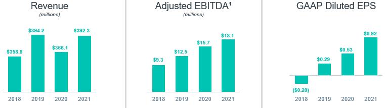 Our higher margin solutions and services business in both North America and Europe contributed 69% of total revenue in 2021, compared with 61% in 2020. This improved mix translated to a measurably higher bottom line and resulted in strong cash generation. GAAP earnings, which included a tax benefit of $0.34 per diluted share, increased to $0.92 per diluted share from $0.53 per diluted share in 2020, and Adjusted EBITDA¹ increased 15% to $18.1 million, with an Adjusted EBITDA margin of 4.6%, which was up 30 basis points from the prior year.