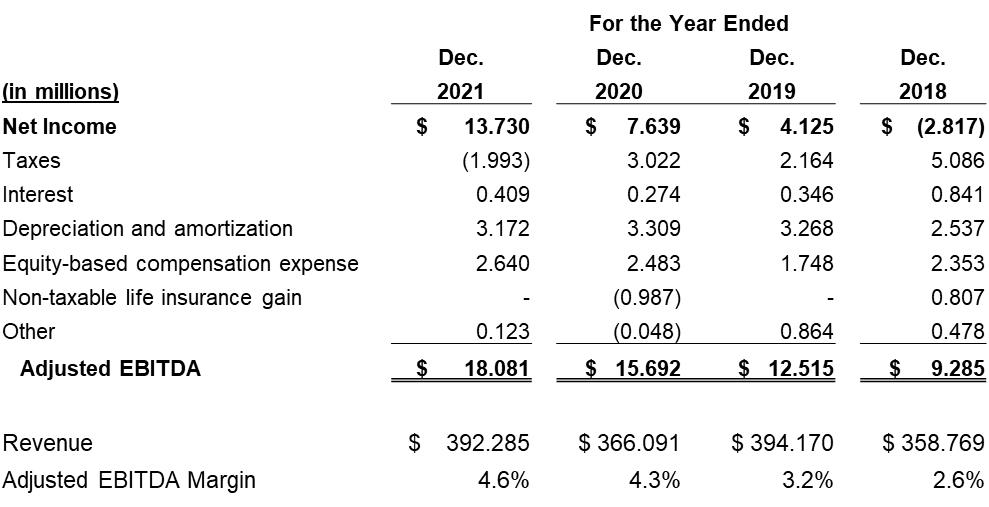 Reconciliation of Net Income to Adjusted EBITDA, which includes earnings before interest (including amortization of deferred debt financing costs), taxes, depreciation and amortization, equity-based compensation, rebranding expenses, non-taxable life insurance gain, and acquisition-related expenses.