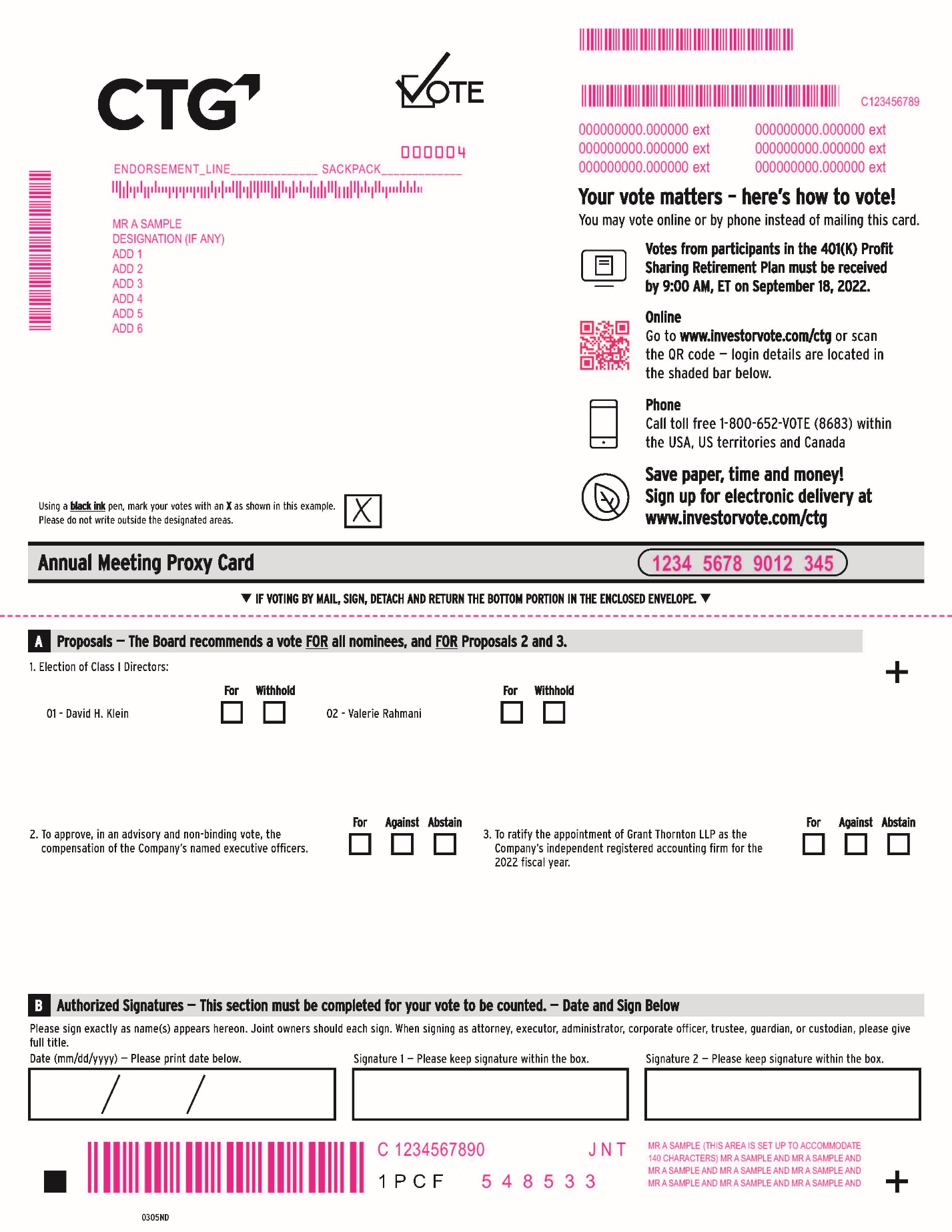 MMMMMMMMMMMM MMMMMMMMM 000004 ENDORSEMENT_LINE______________ SACKPACK_____________ MR ASAMPLE DESIGNATION (IF ANY) ADD 1 ADD 2 ADD 3 ADD 4 ADD 5 ADD 6 Using a black ink pen, mark your votes with an X as shown in this example. Please do not write outside the designated areas. MMMMMMMMMMMMMMM C123456789 000000000.000000 ext 000000000.000000 ext 000000000.000000 ext 000000000.000000 ext 000000000.000000 ext 000000000.000000 ext Your vote matters – here’s how to vote! You may vote online or by phone instead of mailing this card. Votes from participants in the 401(K) Profit Sharing Retirement Plan must be received by 9:00 AM, ET on September 18, 2022. Online Go to www.investorvote.com/ctg or scan the QR code — login details are located in the shaded bar below. Phone Call toll free 1-800-652-VOTE (8683) within the USA, US territories and Canada Save paper, time and money! Sign up for electronic delivery at www.investorvote.com/ctg Annual Meeting Proxy Card 1234 5678 9012 345 • IF VOTING BY MAIL, SIGN, DETACH AND RETURN THE BOTTOM PORTION IN THE ENCLOSED ENVELOPE. • A Proposals — The Board recommends a vote FOR all nominees, and FOR Proposals 2 and 3. 1. Election of Class I Directors: + For Withhold For Withhold 01 - David H. Klein 02 - Valerie Rahmani For Against Abstain For Against Abstain 2. To approve, in an advisory and non-binding vote, the 3.To ratify the appointment of Grant Thornton LLP as the compensation of the Company’s named executive officers. Company’s independent registered accounting firm for the 2022 fiscal year. Authorized Signatures — This section must be completed for your vote to be counted. — Date and Sign Below B Please sign exactly as name(s) appears hereon. Joint owners should each sign. When signing as attorney, executor, administrator, corporate officer, trustee, guardian, or custodian, please give full title. Date (mm/dd/yyyy) — Please print date below. Signature 1 — Please keep signature within the box. Signature 2 — Please keep signature within the box. MR A SAMPLE (THIS AREA IS SET UPTOACCOMMODATE C 1234567890 JNT 140 CHARACTERS) MR A SAMPLE AND MR A SAMPLE AND MR ASAMPLE AND MR ASAMPLE AND MR ASAMPLE AND 1PCF 548533 MR ASAMPLE AND MR ASAMPLE AND MR ASAMPLE AND MMMMMMM + 03O5ND