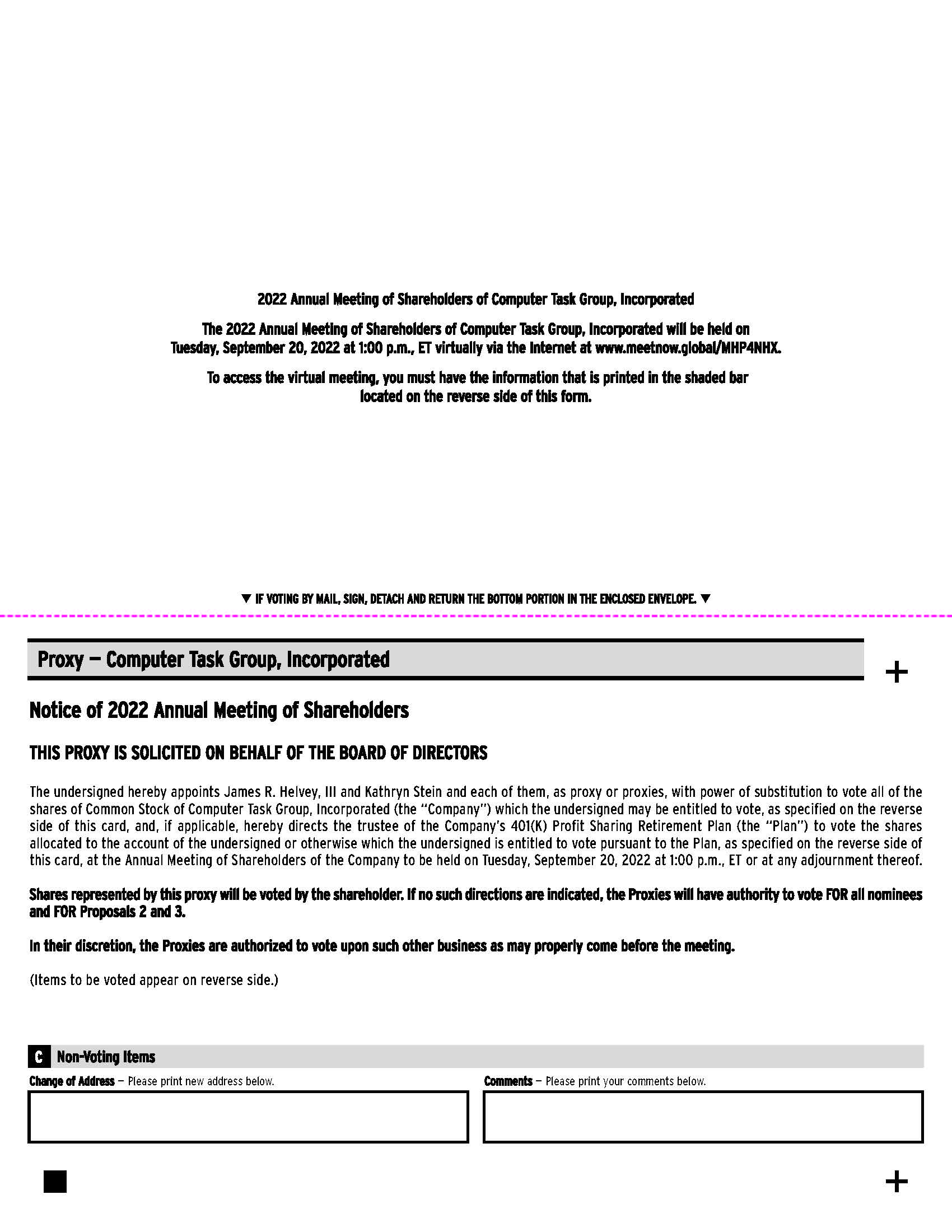 2022 Annual Meeting of Shareholders of Computer Task Group, Incorporated The 2022 Annual Meeting of Shareholders of Computer Task Group, Incorporated will be held on Tuesday, September 20, 2022 at 1:00 p.m., ET virtually via the Internet at www.meetnow.global/MHP4NHX. To access the virtual meeting, you must have the information that is printed in the shaded bar located on the reverse side of this form. • IF VOTING BY MAIL, SIGN, DETACH AND RETURN THE BOTTOM PORTION IN THE ENCLOSED ENVELOPE. • Proxy — Computer Task Group, Incorporated + Notice of 2022 Annual Meeting of Shareholders THIS PROXY IS SOLICITED ON BEHALF OF THE BOARD OF DIRECTORS The undersigned hereby appoints James R. Helvey, III and Kathryn Stein and each of them, as proxy or proxies, with power of substitution to vote all of the shares of Common Stock of Computer Task Group, Incorporated (the “Company”) which the undersigned may be entitled to vote, as specified on the reverse side of this card, and, if applicable, hereby directs the trustee of the Company’s 401(K) Profit Sharing Retirement Plan (the “Plan”) to vote the shares allocated to the account of the undersigned or otherwise which the undersigned is entitled to vote pursuant to the Plan, as specified on the reverse side of this card, at the Annual Meeting of Shareholders of the Company to be held on Tuesday, September 20, 2022 at 1:00 p.m., ET or at any adjournment thereof. Shares represented by this proxy will be voted by the shareholder. If no such directions are indicated, the Proxies will have authority to vote FOR all nominees and FOR Proposals 2 and 3. In their discretion, the Proxies are authorized to vote upon such other business as may properly come before the meeting. (Items to be voted appear on reverse side.) Non-Voting Items C Change of Address — Please print new address below. Comments — Please print your comments below. +