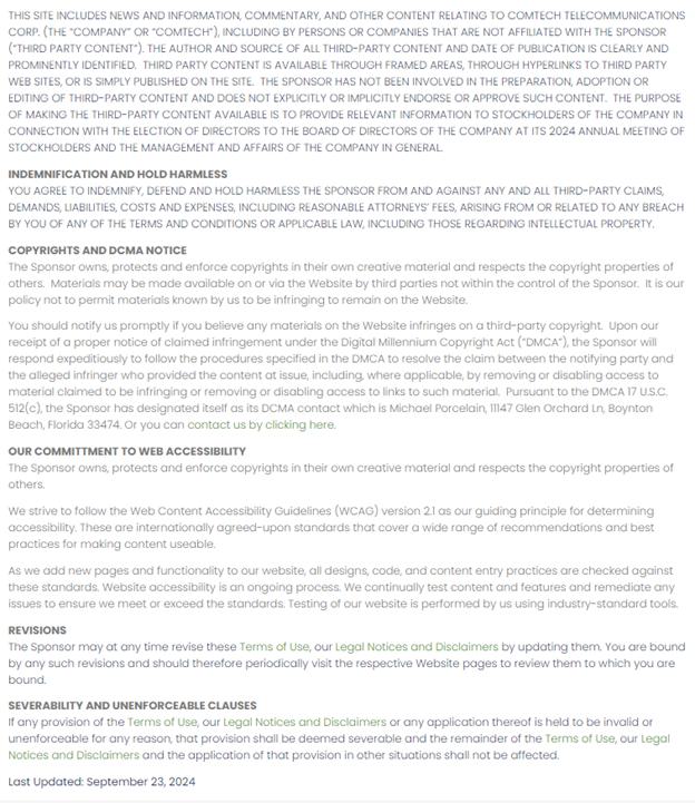 We are fully committed to Comtech’s future success and directly aligned with our fellow common stockholders. Accordingly, Mike has nominated a slate of eight highly qualified director candidates for election to the Board at the upcoming Fiscal 2024 Annual Meeting of Stockholders. The nominees bring a blend of knowledge, expertise, and relevant industry experience that we believe will be invaluable to Comtech’s future. More detailed information about these director candidates is provided below and can be found in a Schedule 13D that was filed with the SEC on Friday, September 20, 2024.