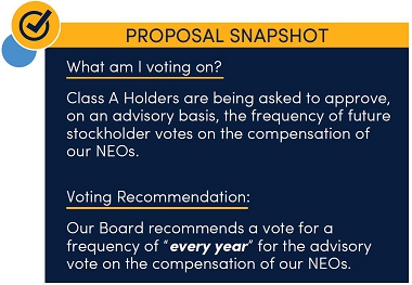 The Class A Holders are entitled to vote to approve on a non-binding, advisory basis, the frequency of future non-binding advisory votes on the compensation of our NEOs. The Class B Holders are not entitled to vote on this matter.