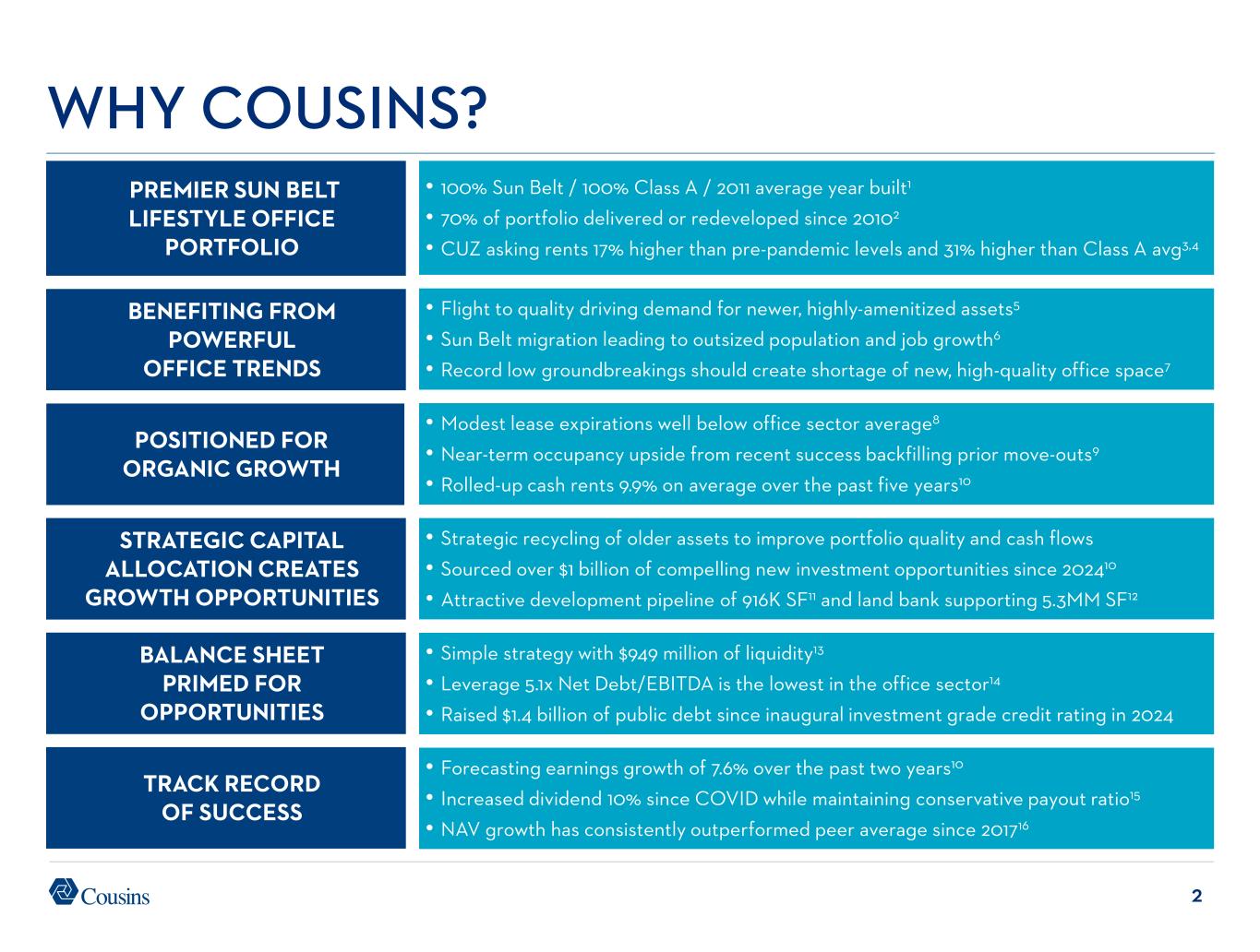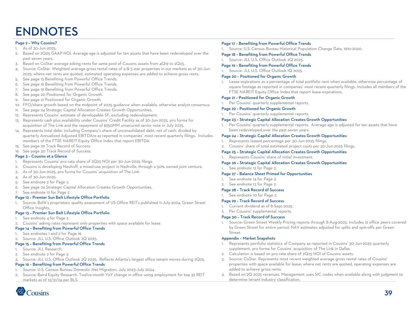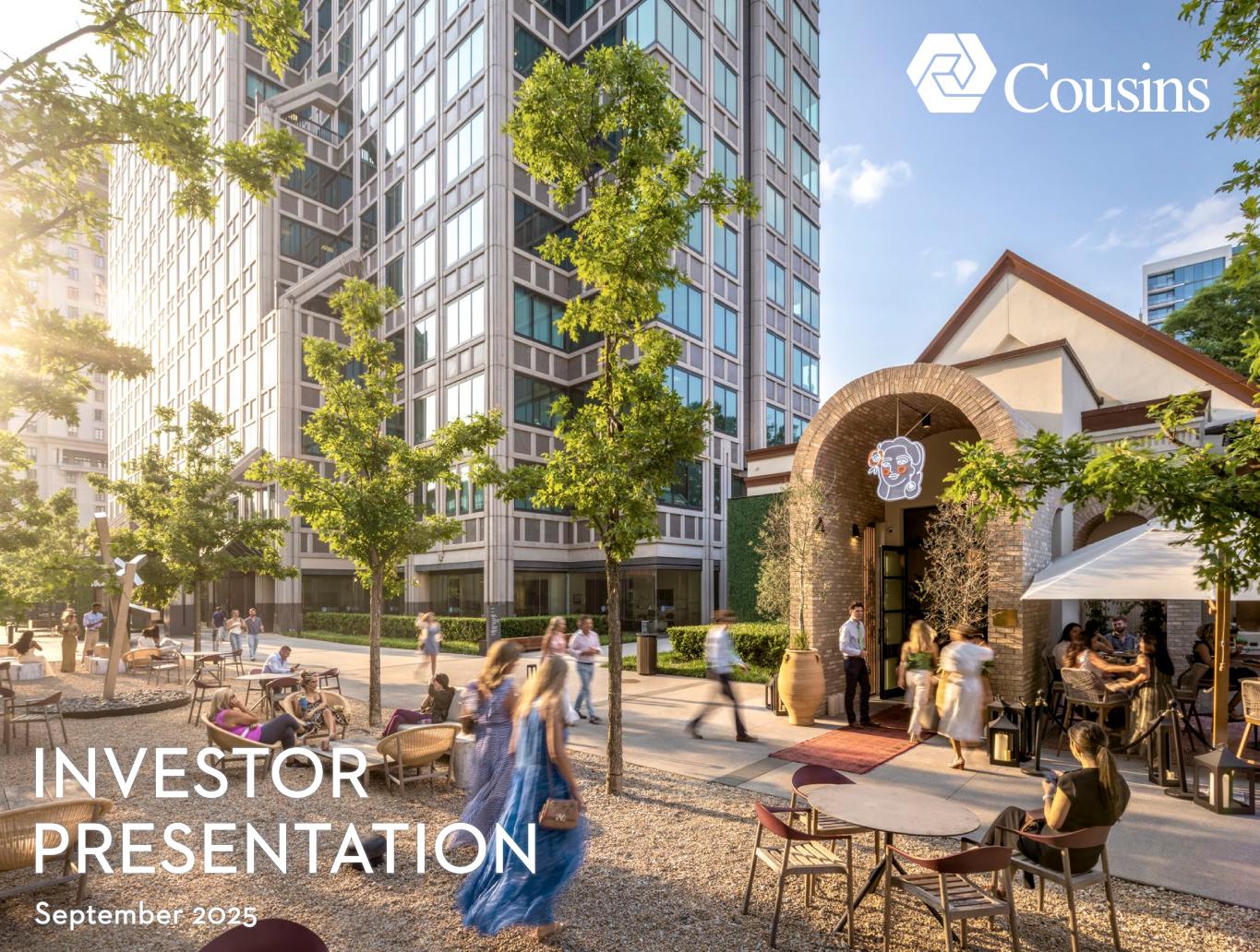 39 Page 17 – Benefiting from Powerful Office Trends 1. Source: U.S. Census Bureau Historical Population Change Data, 1910-2020. Page 18 – Benefiting from Powerful Office Trends 1. Source: JLL U.S. Office Outlook 2Q 2025. Page 19 – Benefiting from Powerful Office Trends 1. Source: JLL U.S. Office Outlook 1Q 2025. Page 20 – Positioned for Organic Growth 1. Lease expirations as a percentage of total portfolio rent when available, otherwise percentage of square footage as reported in companies’ most recent quarterly filings. Includes all members of the FTSE NAREIT Equity Office Index that report lease expirations. Page 21 – Positioned for Organic Growth 1. Per Cousins’ quarterly supplemental reports. Page 22 – Positioned for Organic Growth 1. Per Cousins’ quarterly supplemental reports. Page 23 – Strategic Capital Allocation Creates Growth Opportunities 1. Per Cousins’ quarterly supplemental reports. Average age is adjusted for ten assets that have been redeveloped over the past seven years. Page 24 – Strategic Capital Allocation Creates Growth Opportunities 1. Represents leased percentage per 30-Jun-2025 filings. 2. Cousins’ share of total estimated project costs per 30-Jun-2025 filings. Page 25 – Strategic Capital Allocation Creates Growth Opportunities 1. Represents Cousins’ share of initial investment. Page 26 – Strategic Capital Allocation Creates Growth Opportunities 1. See endnote 12 for Page 2. Page 27 – Balance Sheet Primed for Opportunities 1. See endnote 14 for Page 2. 2. See endnote 13 for Page 2. Page 28 – Track Record of Success 1. See endnote 10 for Page 2. Page 29 – Track Record of Success 1. Current dividend as of 8-Sept-2025. 2. Per Cousins’ supplemental reports. Page 30 – Track Record 0f Success 1. Source: Green Street Weekly Pricing reports through 8-Aug-2025. Includes 12 office peers covered by Green Street for entire period. NAV estimates adjusted for splits and spin-offs per Green Street. Appendix – Market Snapshots 1. Represents portfolio statistics of Company as reported in Cousins’ 30-Jun-2025 quarterly supplement, pro forma for Cousins’ acquisition of The Link in Dallas. 2. Calculation is based on pro-rata share of 2Q25 NOI of Cousins assets. 3. Source: CoStar. Represents most recent weighted average gross rental rates of Cousins’ properties with space available for lease; where net rents are quoted, operating expenses are added to achieve gross rents. 4. Based on 2Q 2025 revenues. Management uses SIC codes when available along with judgment to determine tenant industry classification. Page 2 – Why Cousins? 1. As of 30-Jun-2025. 2. Based on 2Q25 GAAP NOI. Average age is adjusted for ten assets that have been redeveloped over the past seven years. 3. Based on CoStar average asking rents for same pool of Cousins assets from 4Q19 to 2Q25. 4. Source: CoStar. Weighted average gross rental rates of 4 & 5 star properties in our markets as of 30-Jun- 2025; where net rents are quoted, estimated operating expenses are added to achieve gross rents. 5. See page 15 Benefiting from Powerful Office Trends. 6. See page 16 Benefiting from Powerful Office Trends. 7. See page 19 Benefiting from Powerful Office Trends. 8. See page 20 Positioned for Organic Growth. 9. See page 21 Positioned for Organic Growth. 10. FFO/share growth based on the midpoint of 2025 guidance when available, otherwise analyst consensus. 11. See page 24 Strategic Capital Allocation Creates Growth Opportunities. 12. Represents Cousins’ estimate of developable SF, excluding redevelopment. 13. Represents cash plus availability under Cousins’ Credit Facility as of 30-Jun-2025, pro forma for acquisition of The Link and the repayment of $250MM unsecured senior note in July 2025. 14. Represents total debt, including Company’s share of unconsolidated debt, net of cash, divided by quarterly Annualized Adjusted EBITDAre as reported in companies’ most recent quarterly filings. Includes members of the FTSE NAREIT Equity Office Index that report EBITDA. 15. See page 29 Track Record of Success. 16. See page 30 Track Record of Success. Page 3 – Cousins at a Glance 1. Represents Cousins’ pro-rata share of 2Q25 NOI per 30-Jun-2025 filings. 2. Cousins is developing Neuhoff, a mixed-use project in Nashville, through a 50% owned joint venture. 3. As of 30-Jun-2025, pro forma for Cousins’ acquisition of The Link. 4. As of 30-Jun-2025. 5. See endnote 2 for Page 2. 6. See page 24 Strategic Capital Allocation Creates Growth Opportunities. 7. See endnote 12 for Page 2. Page 12 – Premier Sun Belt Lifestyle Office Portfolio 1. Source: BofA’s proprietary quality assessment of US Office REITs published 11-July-2024, Green Street Office Insights. Page 13 – Premier Sun Belt Lifestyle Office Portfolio 1. See endnote 4 for Page 2. 2. Cousins’ asking rates represent only properties with space available for lease. Page 14 – Benefiting from Powerful Office Trends 1. See endnotes 1 and 2 for Page 16. 2. Source: JLL U.S. Office Outlook 2Q 2025. Page 15 – Benefiting from Powerful Office Trends 1. Source: JLL Research. 2. See endnote 2 for Page 2. 3. Source: JLL U.S. Office Outlook 2Q 2025. Reflects Atlanta’s largest office tenant moves during 2Q25. Page 16 – Benefiting from Powerful Office Trends 1. Source: U.S. Census Bureau Domestic Net Migration, July 2023-July 2024. 2. Source: Baird Equity Research. Twelve-month YoY change in office using employment for top 32 REIT markets as of 12/31/24 per BLS. ENDNOTES