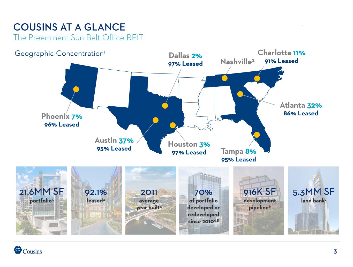 2 BENEFITING FROM POWERFUL OFFICE TRENDS BALANCE SHEET PRIMED FOR OPPORTUNITIES PREMIER SUN BELT LIFESTYLE OFFICE PORTFOLIO TRACK RECORD OF SUCCESS WHY COUSINS? • Flight to quality driving demand for newer, highly-amenitized assets5 • Sun Belt migration leading to outsized population and job growth6 • Record low groundbreakings should create shortage of new, high-quality office space7 • 100% Sun Belt / 100% Class A / 2011 average year built1 • 70% of portfolio delivered or redeveloped since 20102 • CUZ asking rents 17% higher than pre-pandemic levels and 31% higher than Class A avg3,4 • Simple strategy with $949 million of liquidity13 • Leverage 5.1x Net Debt/EBITDA is the lowest in the office sector14 • Raised $1.4 billion of public debt since inaugural investment grade credit rating in 2024 • Forecasting earnings growth of 7.6% over the past two years10 • Increased dividend 10% since COVID while maintaining conservative payout ratio15 • NAV growth has consistently outperformed peer average since 201716 STRATEGIC CAPITAL ALLOCATION CREATES GROWTH OPPORTUNITIES • Strategic recycling of older assets to improve portfolio quality and cash flows • Sourced over $1 billion of compelling new investment opportunities since 202410 • Attractive development pipeline of 916K SF11 and land bank supporting 5.3MM SF12 POSITIONED FOR ORGANIC GROWTH • Modest lease expirations well below office sector average8 • Near-term occupancy upside from recent success backfilling prior move-outs9 • Rolled-up cash rents 9.9% on average over the past five years10