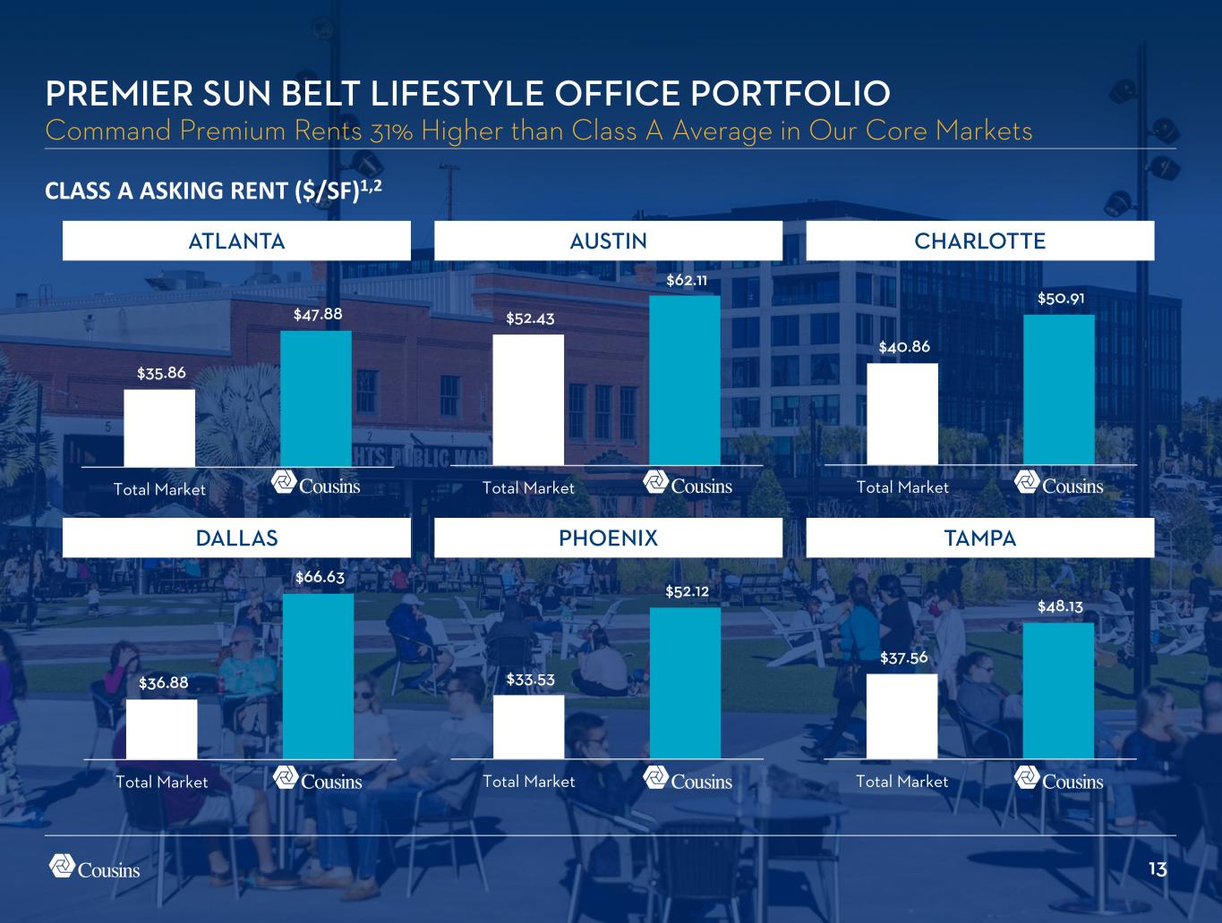 12 PREMIER SUN BELT LIFESTYLE OFFICE PORTFOLIO Cousins Portfolio Quality Ranks at the Top of Office REIT Peers 0 10 20 30 40 50 60 CUZ BXP PGRE KRC HIW HPP SLG VNO ESRT DEI Rent Score Build Score Amenity Score BANK OF AMERICA ANALYSIS OF PORTFOLIO QUALITY1 “Buildings along the upper tier of the quality spectrum are clearly emerging victorious on a relative basis in a world where tenants are overwhelmingly favoring “high-quality” workplaces as a means of incentivizing employees to return to the office...There seems to be more room for “pent-up” demand in higher quality assets, whereas lower quality assets won’t benefit nearly as much should utilization continue in its current range.” - Green Street, Office Insights 7/15/25