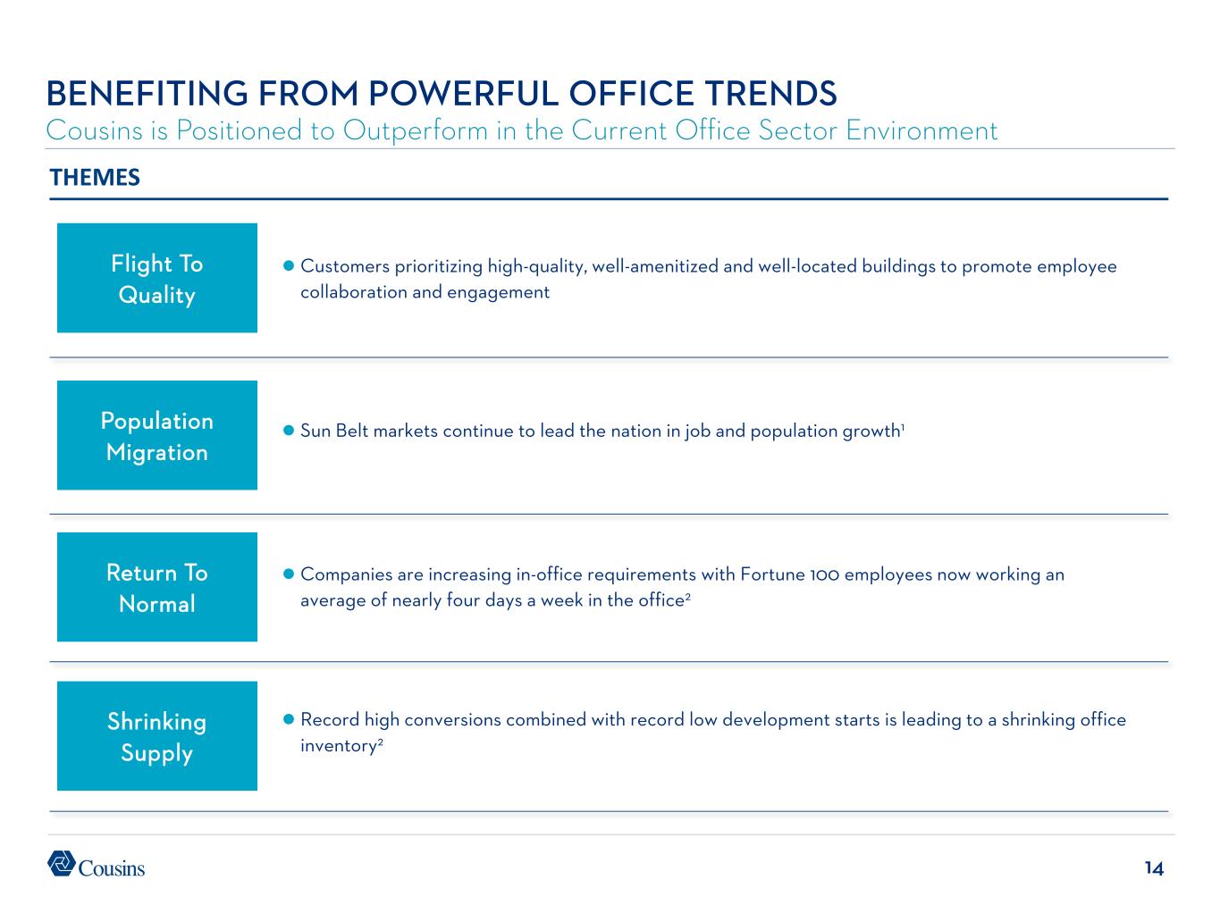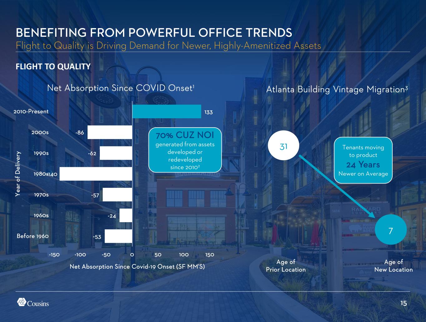 14 BENEFITING FROM POWERFUL OFFICE TRENDS Cousins is Positioned to Outperform in the Current Office Sector Environment Customers prioritizing high-quality, well-amenitized and well-located buildings to promote employee collaboration and engagement Flight To Quality Population Migration Return To Normal Sun Belt markets continue to lead the nation in job and population growth1 Companies are increasing in-office requirements with Fortune 100 employees now working an average of nearly four days a week in the office2 Shrinking Supply Record high conversions combined with record low development starts is leading to a shrinking office inventory2 THEMES