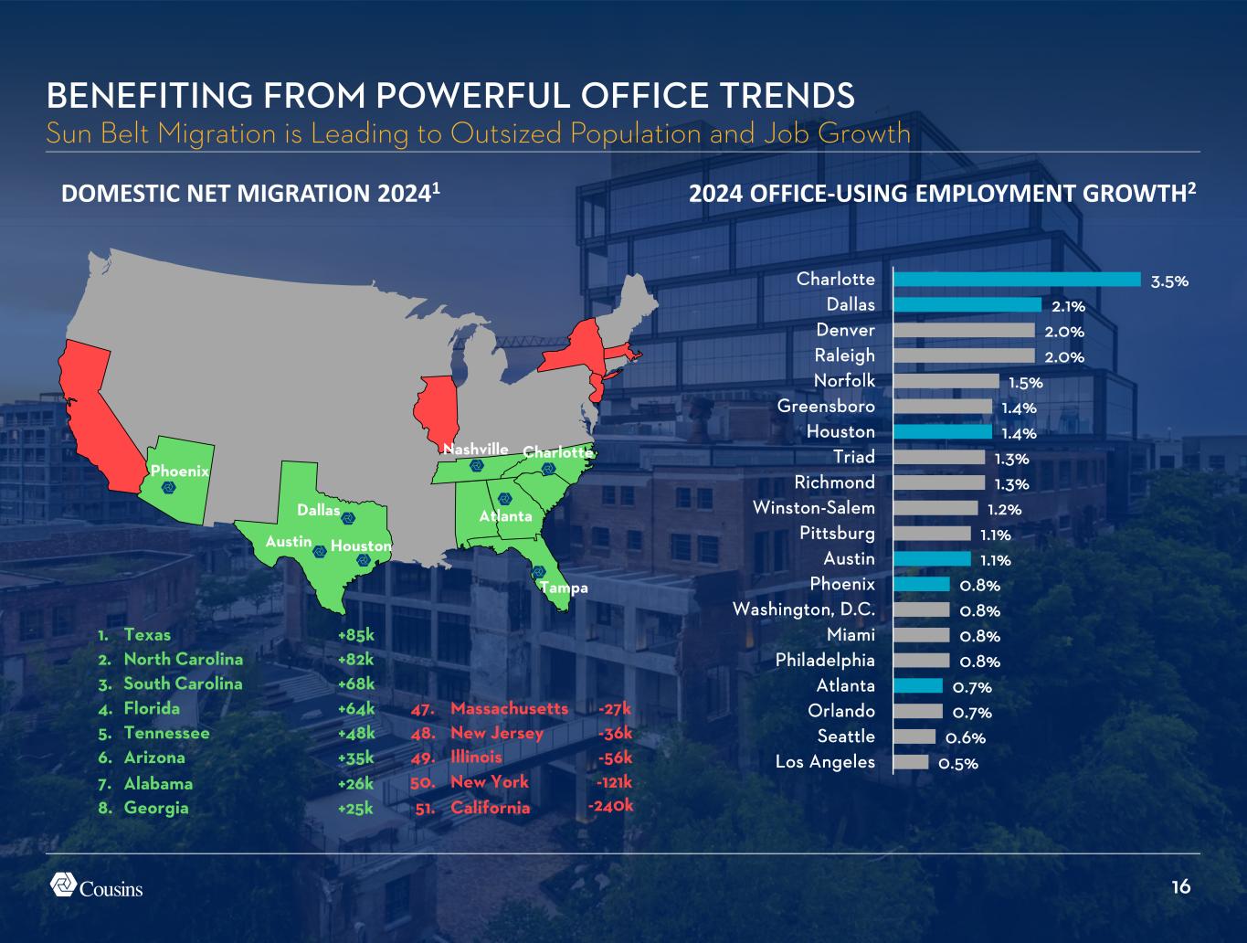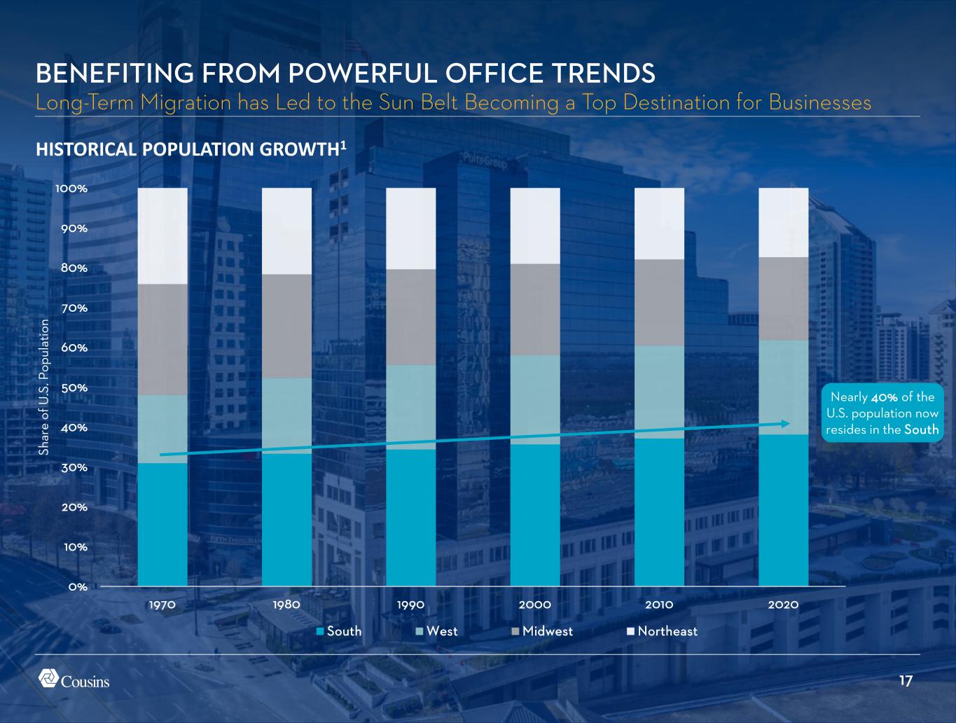 16 DOMESTIC NET MIGRATION 20241 BENEFITING FROM POWERFUL OFFICE TRENDS Sun Belt Migration is Leading to Outsized Population and Job Growth Houston Dallas Austin Nashville Charlotte Atlanta Tampa Phoenix 1. Texas +85k 2. North Carolina +82k 3. South Carolina +68k 47. Massachusetts -27k4. Florida +64k 48. New Jersey -36k5. Tennessee +48k 49. Illinois -56k6. Arizona +35k 50. New York -121k7. Alabama +26k 51. California -240k8. Georgia +25k 0.5% 0.6% 0.7% 0.7% 0.8% 0.8% 0.8% 0.8% 1.1% 1.1% 1.2% 1.3% 1.3% 1.4% 1.4% 1.5% 2.0% 2.0% 2.1% 3.5% Los Angeles Seattle Orlando Atlanta Philadelphia Miami Washington, D.C. Phoenix Austin Pittsburg Winston-Salem Richmond Triad Houston Greensboro Norfolk Raleigh Denver Dallas Charlotte 2024 OFFICE-USING EMPLOYMENT GROWTH2