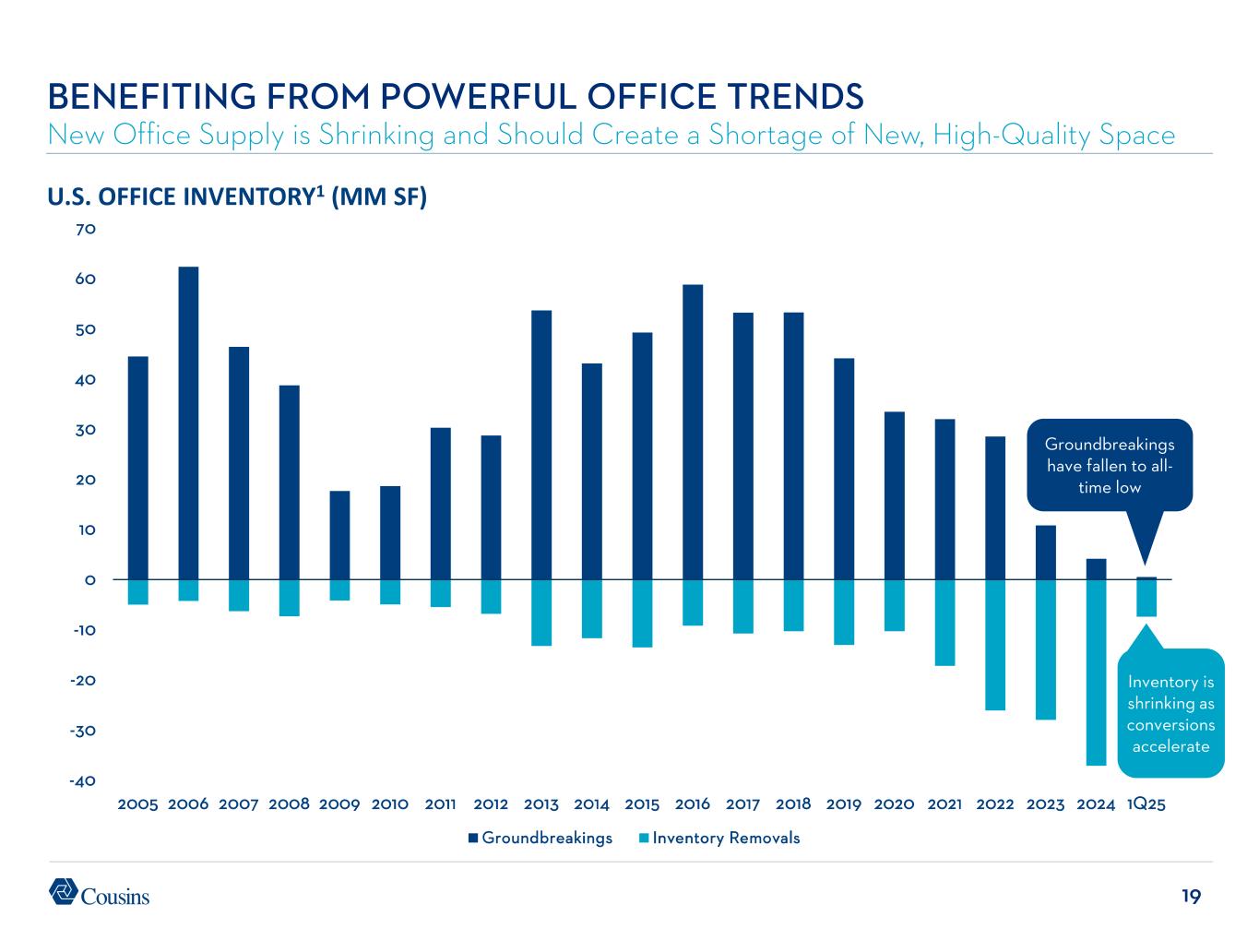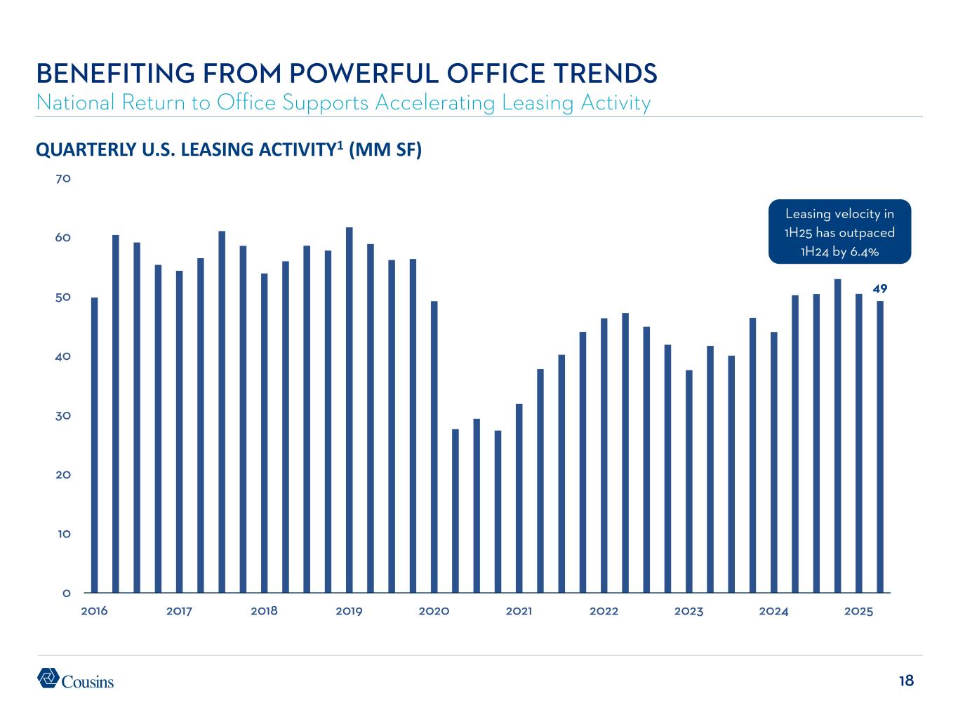 18 49 0 10 20 30 40 50 60 70 2016 2017 2018 2019 2020 2021 2022 2023 2024 2025 QUARTERLY U.S. LEASING ACTIVITY1 (MM SF) BENEFITING FROM POWERFUL OFFICE TRENDS National Return to Office Supports Accelerating Leasing Activity Leasing velocity in 1H25 has outpaced 1H24 by 6.4%