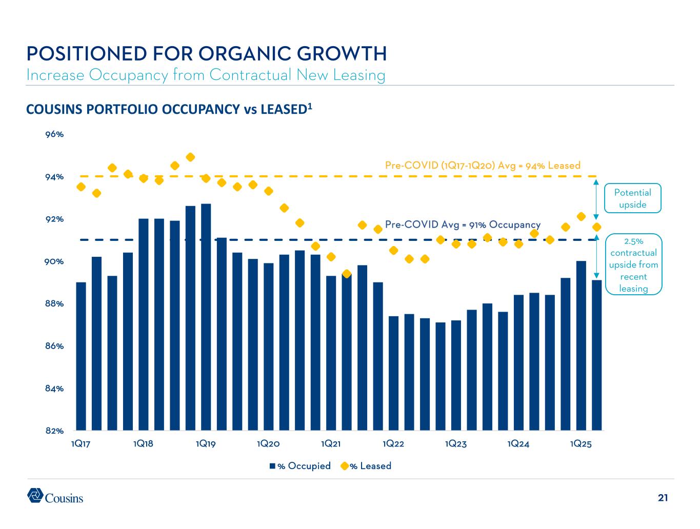 20 0% 10% 20% 30% 40% 50% DEI FSP CDP HPP HIW PDM PGRE OPI BDN VNO ESRT SLG CUZ KRC DEA BXP 2025 2026 2027 LEASE EXPIRATIONS BY YEAR1 POSITIONED FOR ORGANIC GROWTH Modest Lease Expirations Well Below Office Sector Average 16.1% Avg = 22.5%