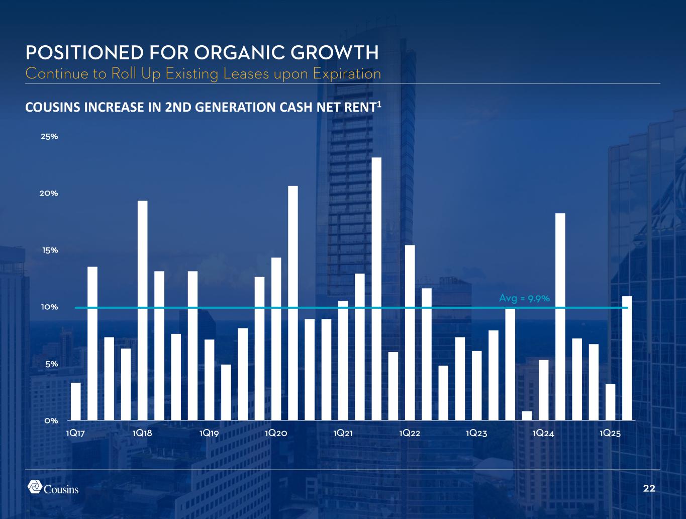 21 82% 84% 86% 88% 90% 92% 94% 96% 1Q17 1Q18 1Q19 1Q20 1Q21 1Q22 1Q23 1Q24 1Q25 % Occupied % Leased COUSINS PORTFOLIO OCCUPANCY vs LEASED1 POSITIONED FOR ORGANIC GROWTH Increase Occupancy from Contractual New Leasing Pre-COVID (1Q17-1Q20) Avg = 94% Leased 2.5% contractual upside from recent leasing Potential upside Pre-COVID Avg = 91% Occupancy