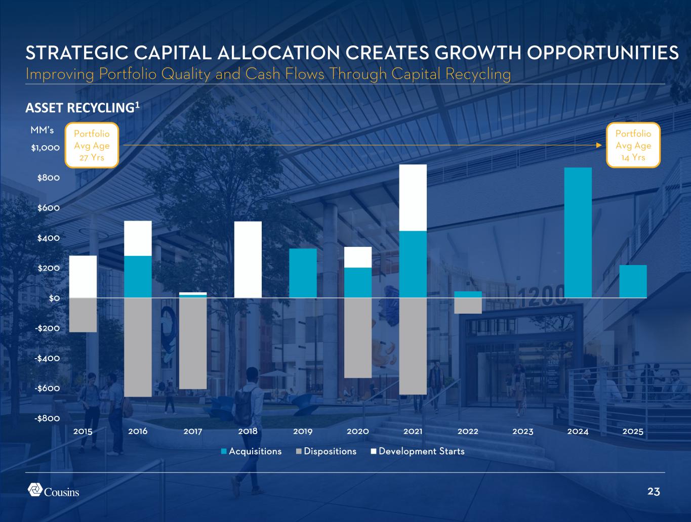 22 0% 5% 10% 15% 20% 25% 1Q17 1Q18 1Q19 1Q20 1Q21 1Q22 1Q23 1Q24 1Q25 POSITIONED FOR ORGANIC GROWTH Continue to Roll Up Existing Leases upon Expiration COUSINS INCREASE IN 2ND GENERATION CASH NET RENT1 Avg = 9.9%