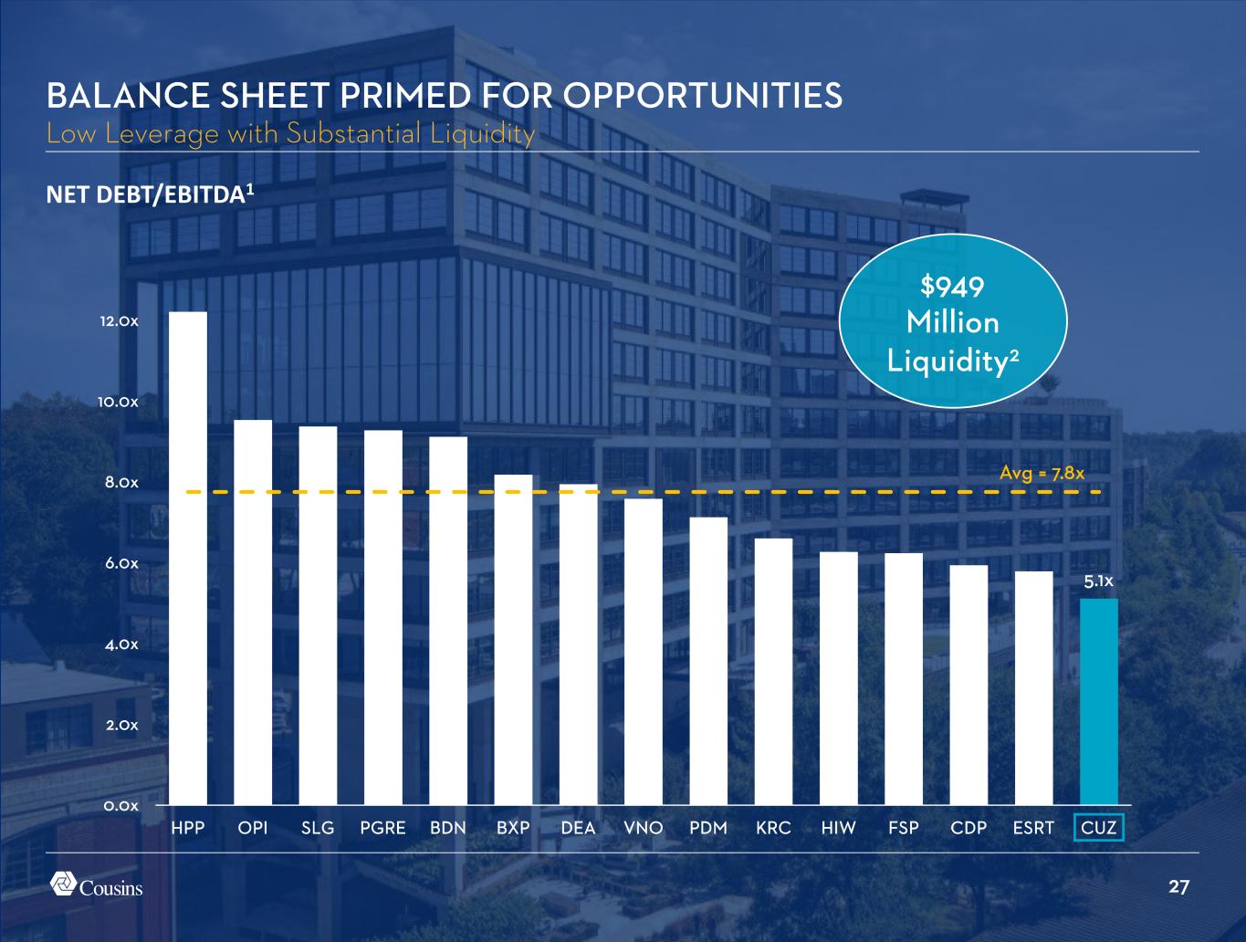 26 DOMAIN POINT LEGACY UNION TWO / THREE LEGACY 600K SF DALLAS MIDTOWN 800K SF 887 WEST PEACHTREE 3354 PEACHTREE ATLANTA AUSTIN 715 PONCE MIDTOWN 200K SF DOMAIN 900K SF TAMPA CORPORATE CENTER V WESTSHORE 180K SF DOMAIN CENTRAL CHARLOTTE 303 TREMONT 1435 S. TRYON SOUTH END 650K SF SOUTH END 520K SF STRATEGIC CAPITAL ALLOCATION CREATES GROWTH OPPORTUNITIES Land Bank Supports 5.3MM SF1 of Additional New Office or Mixed-Use Development BUCKHEAD 800K SF DOMAIN 600K SF