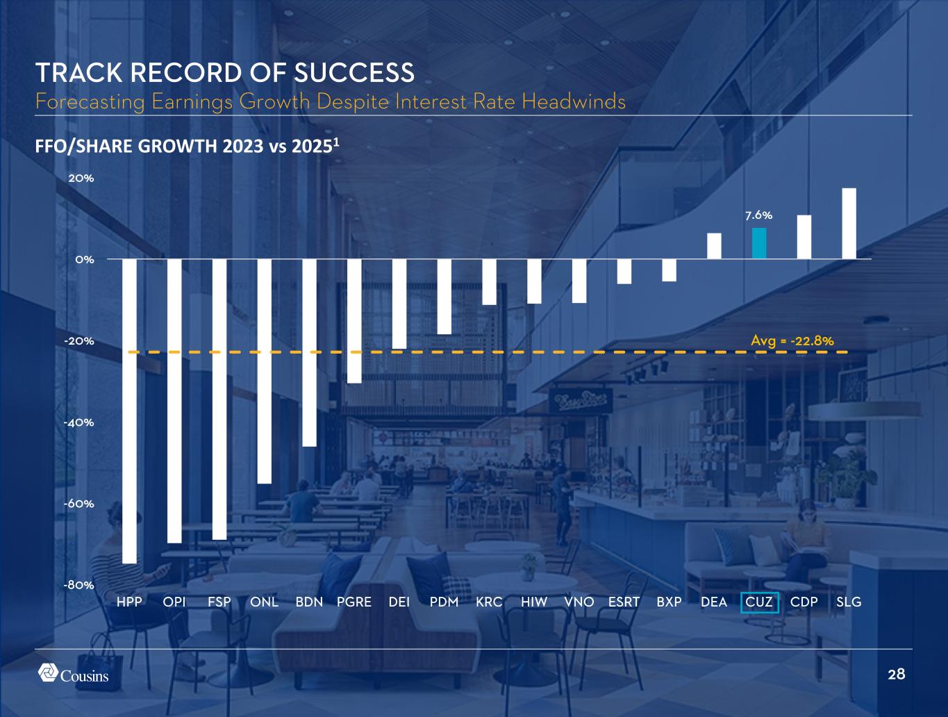 27 5.1x 0.0x 2.0x 4.0x 6.0x 8.0x 10.0x 12.0x HPP OPI SLG PGRE BDN BXP DEA VNO PDM KRC HIW FSP CDP ESRT CUZ NET DEBT/EBITDA1 $949 Million Liquidity2 BALANCE SHEET PRIMED FOR OPPORTUNITIES Low Leverage with Substantial Liquidity Avg = 7.8x