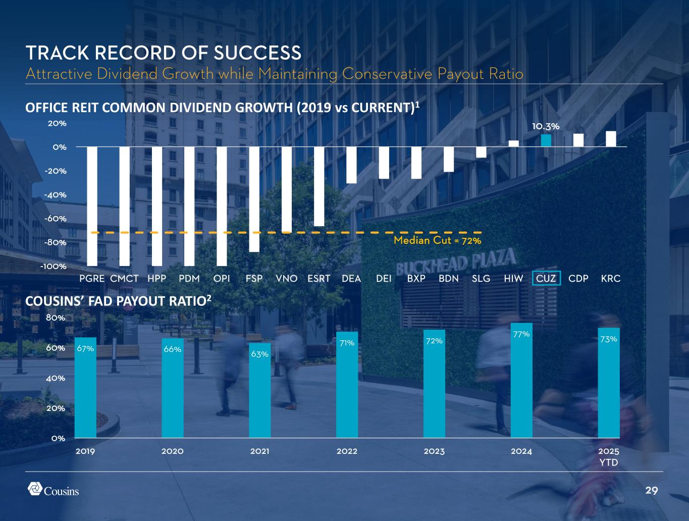 28 7.6% -80% -60% -40% -20% 0% 20% HPP OPI FSP ONL BDN PGRE DEI PDM KRC HIW VNO ESRT BXP DEA CUZ CDP SLG FFO/SHARE GROWTH 2023 vs 20251 TRACK RECORD OF SUCCESS Forecasting Earnings Growth Despite Interest Rate Headwinds Avg = -22.8%