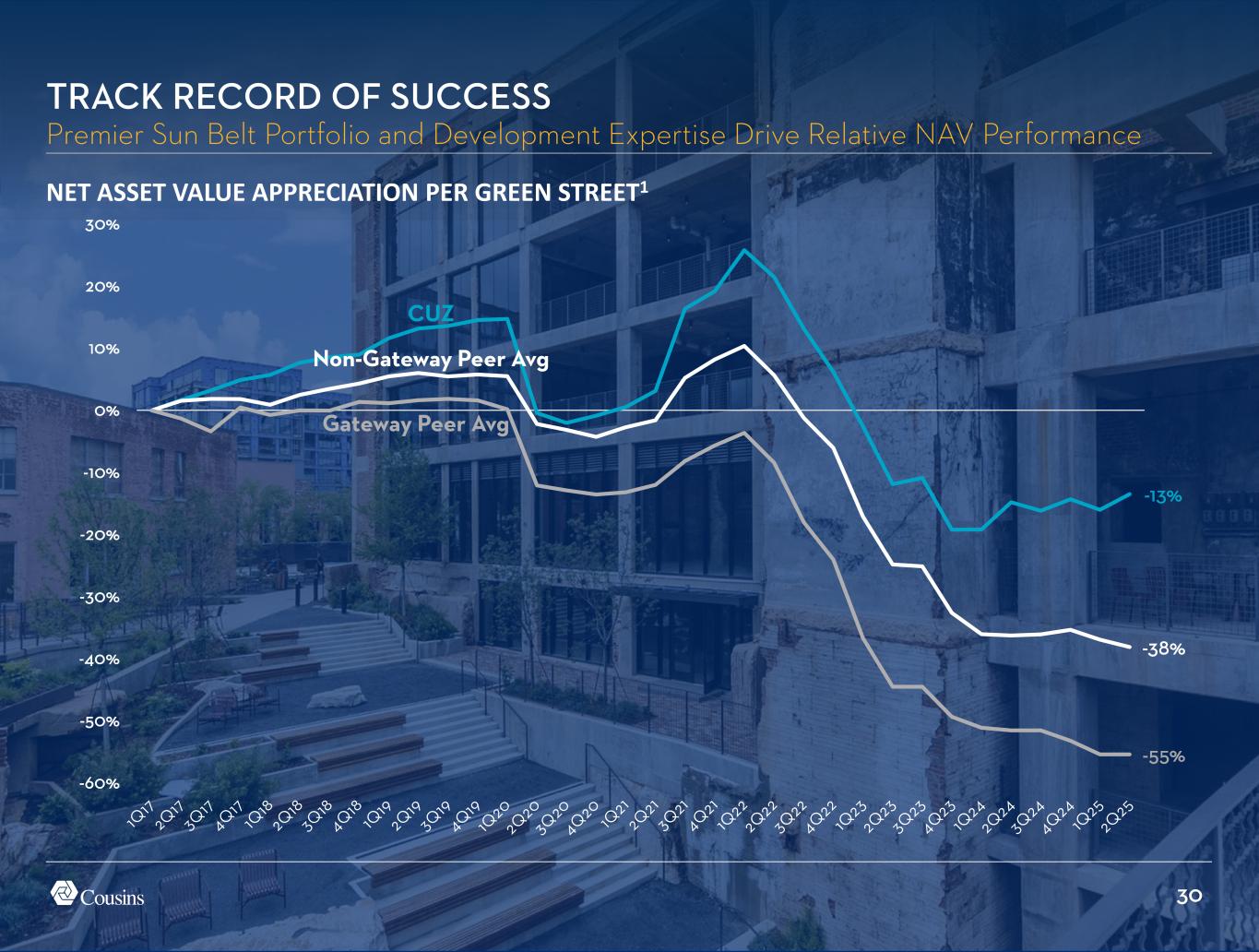 29 10.3% -100% -80% -60% -40% -20% 0% 20% PGRE CMCT HPP PDM OPI FSP VNO ESRT DEA DEI BXP BDN SLG HIW CUZ CDP KRC 67% 66% 63% 71% 72% 77% 73% 0% 20% 40% 60% 80% 2019 2020 2021 2022 2023 2024 2025 YTD TRACK RECORD OF SUCCESS Attractive Dividend Growth while Maintaining Conservative Payout Ratio OFFICE REIT COMMON DIVIDEND GROWTH (2019 vs CURRENT)1 COUSINS’ FAD PAYOUT RATIO2 Median Cut = 72%
