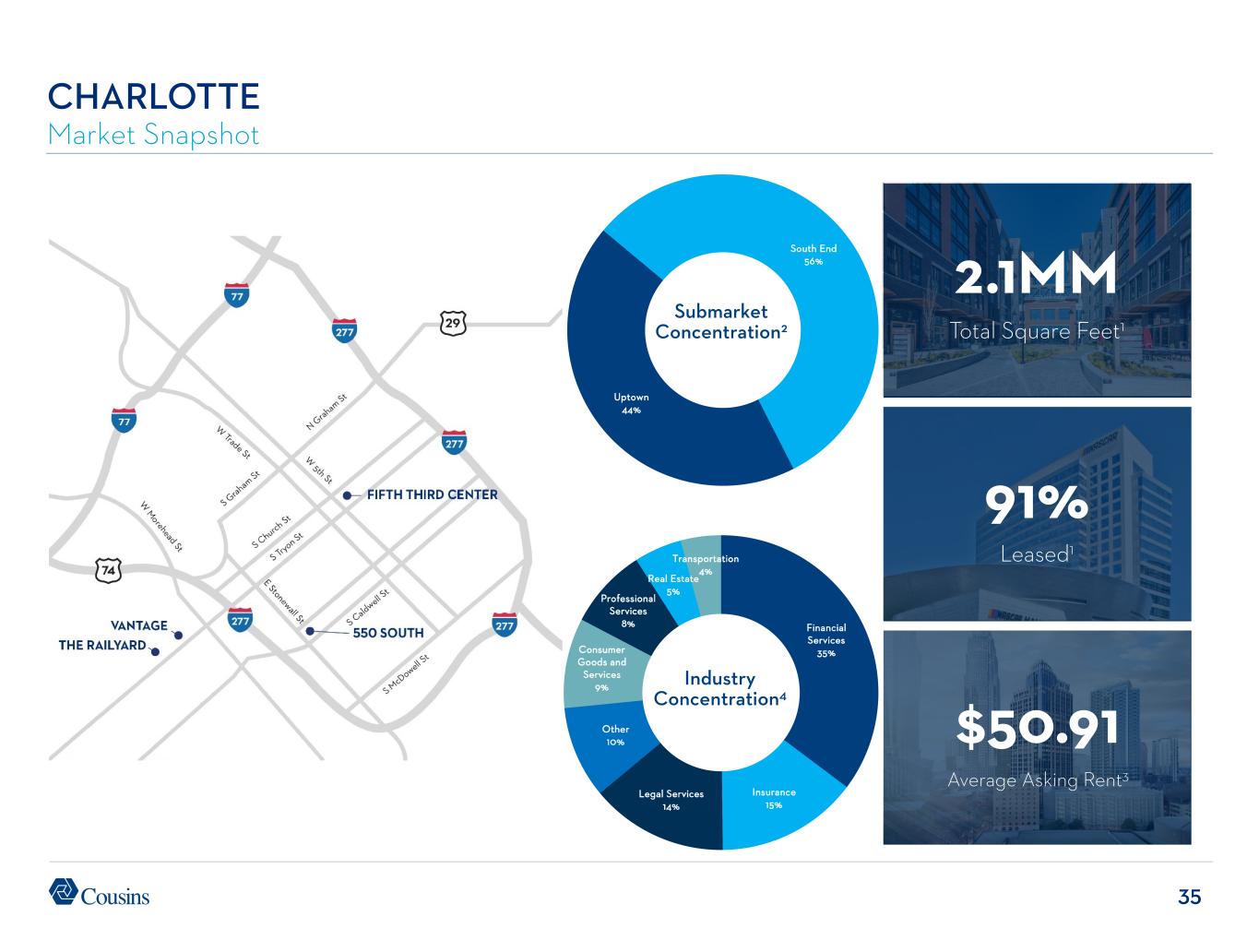 34 AUSTIN Market Snapshot 5.7MM Total Square Feet1 95% Leased1 $62.11 Average Asking Rent3 Industry Concentration4 Submarket Concentration2 Technology 53% Legal Services 12% Energy 8% Financial Services 7% Consumer Goods and Services 7% Other 5% Professional Services 4% Marketing 2% Healthcare 2% CBD 52% Domain 39% Southwest 7% Northwest 2%