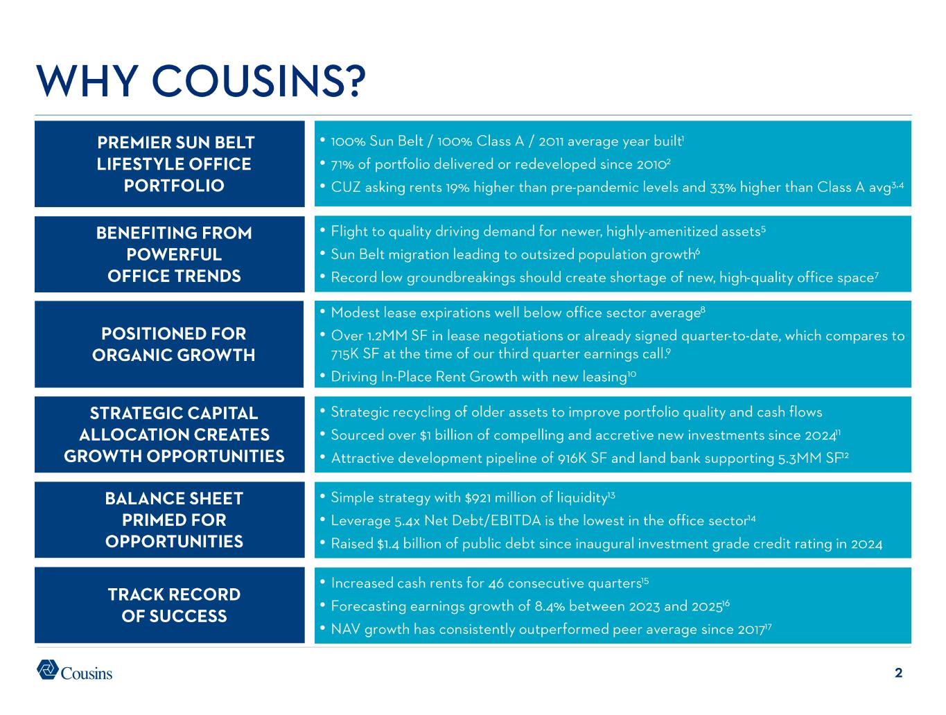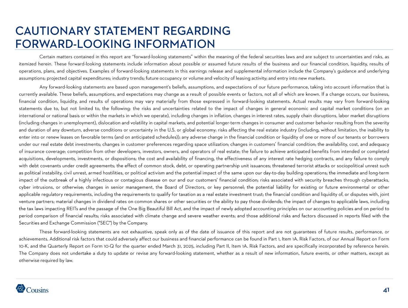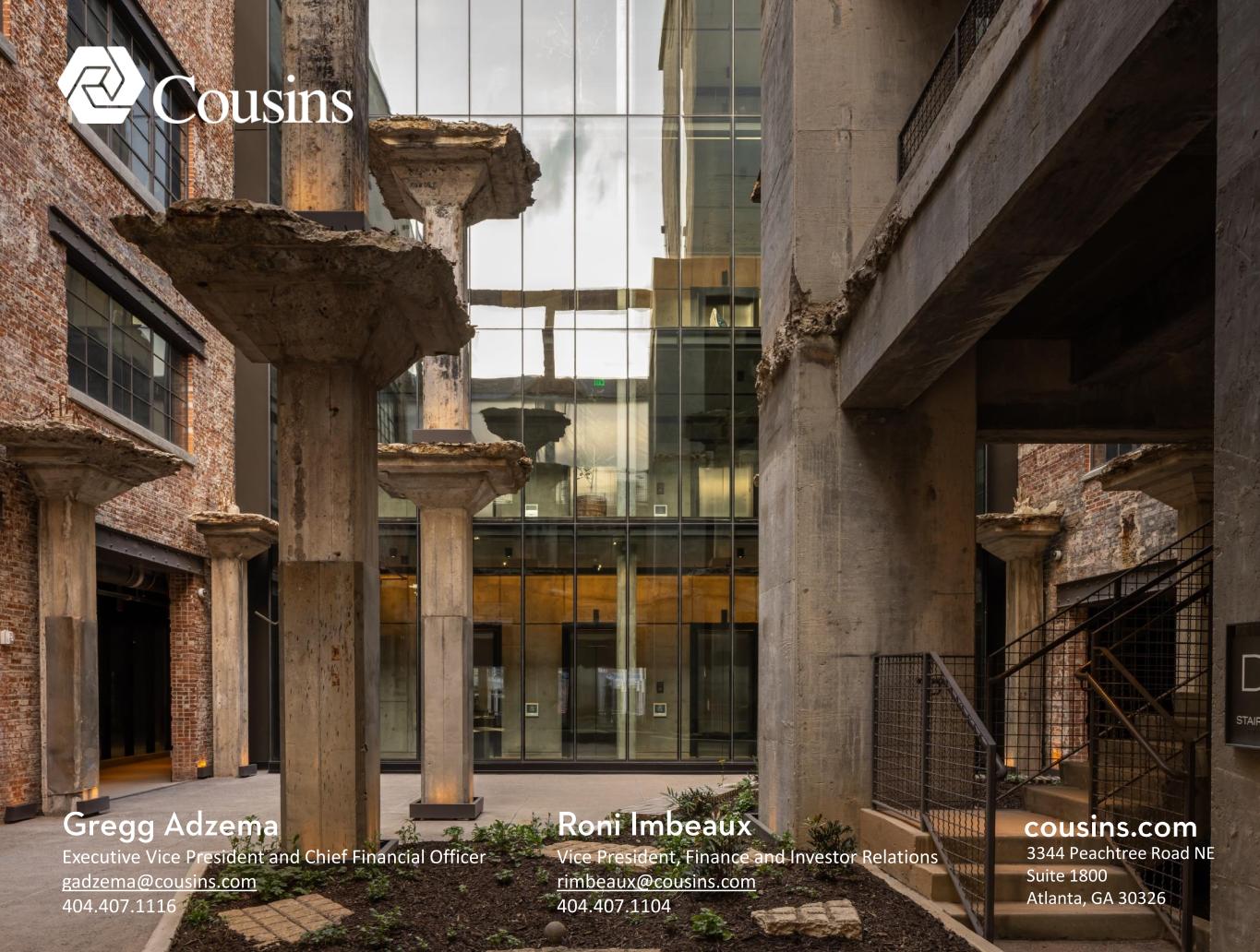 3344 Peachtree Road NE Suite 1800 Atlanta, GA 30326 Executive Vice President and Chief Financial Officer gadzema@cousins.com 404.407.1116 Vice President, Finance and Investor Relations rimbeaux@cousins.com 404.407.1104