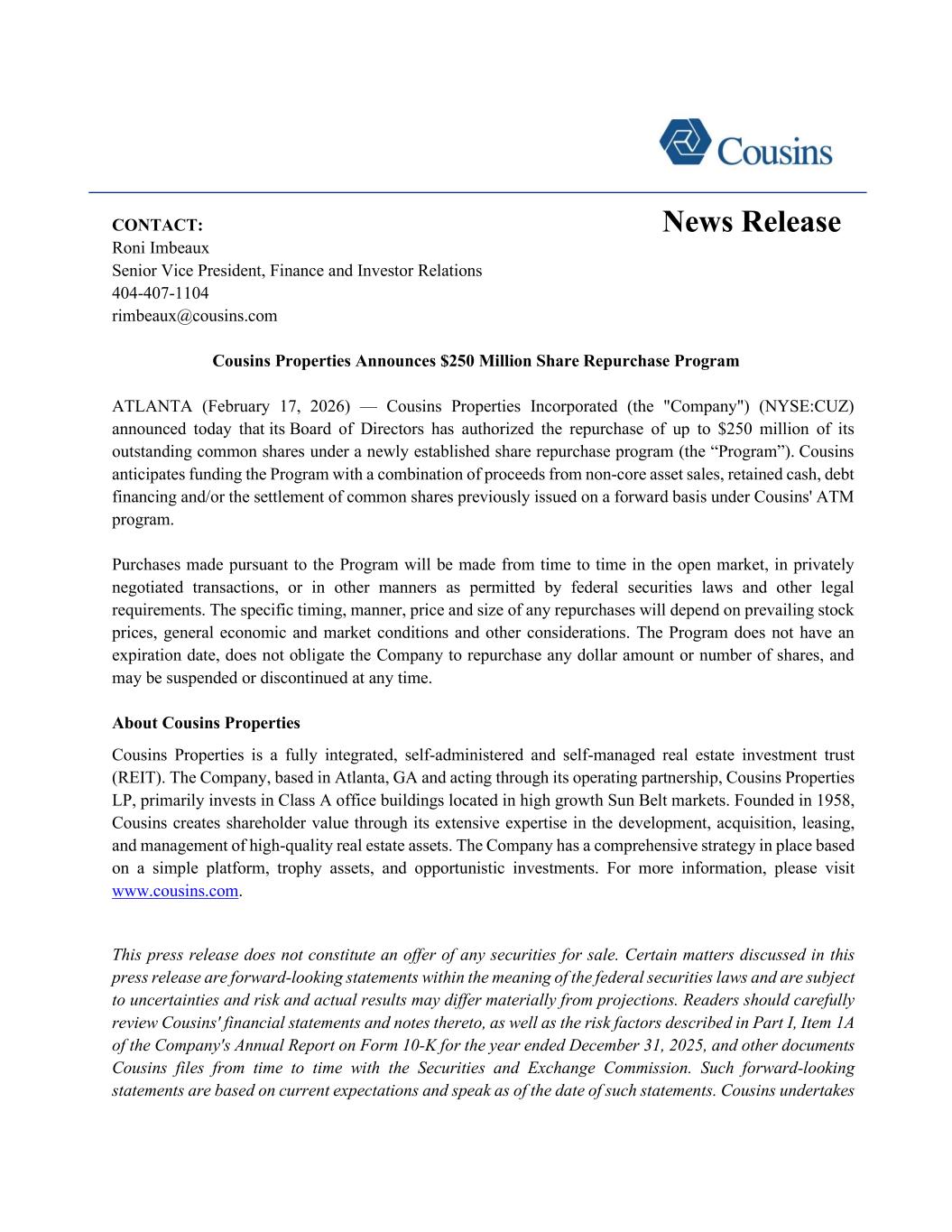 CONTACT: Roni Imbeaux Senior Vice President, Finance and Investor Relations 404-407-1104 rimbeaux@cousins.com Cousins Properties Announces $250 Million Share Repurchase Program ATLANTA (February 17, 2026) — Cousins Properties Incorporated (the "Company") (NYSE:CUZ) announced today that its Board of Directors has authorized the repurchase of up to $250 million of its outstanding common shares under a newly established share repurchase program (the “Program”). Cousins anticipates funding the Program with a combination of proceeds from non-core asset sales, retained cash, debt financing and/or the settlement of common shares previously issued on a forward basis under Cousins' ATM program. Purchases made pursuant to the Program will be made from time to time in the open market, in privately negotiated transactions, or in other manners as permitted by federal securities laws and other legal requirements. The specific timing, manner, price and size of any repurchases will depend on prevailing stock prices, general economic and market conditions and other considerations. The Program does not have an expiration date, does not obligate the Company to repurchase any dollar amount or number of shares, and may be suspended or discontinued at any time. About Cousins Properties Cousins Properties is a fully integrated, self-administered and self-managed real estate investment trust (REIT). The Company, based in Atlanta, GA and acting through its operating partnership, Cousins Properties LP, primarily invests in Class A office buildings located in high growth Sun Belt markets. Founded in 1958, Cousins creates shareholder value through its extensive expertise in the development, acquisition, leasing, and management of high-quality real estate assets. The Company has a comprehensive strategy in place based on a simple platform, trophy assets, and opportunistic investments. For more information, please visit www.cousins.com. This press release does not constitute an offer of any securities for sale. Certain matters discussed in this press release are forward-looking statements within the meaning of the federal securities laws and are subject to uncertainties and risk and actual results may differ materially from projections. Readers should carefully review Cousins' financial statements and notes thereto, as well as the risk factors described in Part I, Item 1A of the Company's Annual Report on Form 10-K for the year ended December 31, 2025, and other documents Cousins files from time to time with the Securities and Exchange Commission. Such forward-looking statements are based on current expectations and speak as of the date of such statements. Cousins undertakes News Release