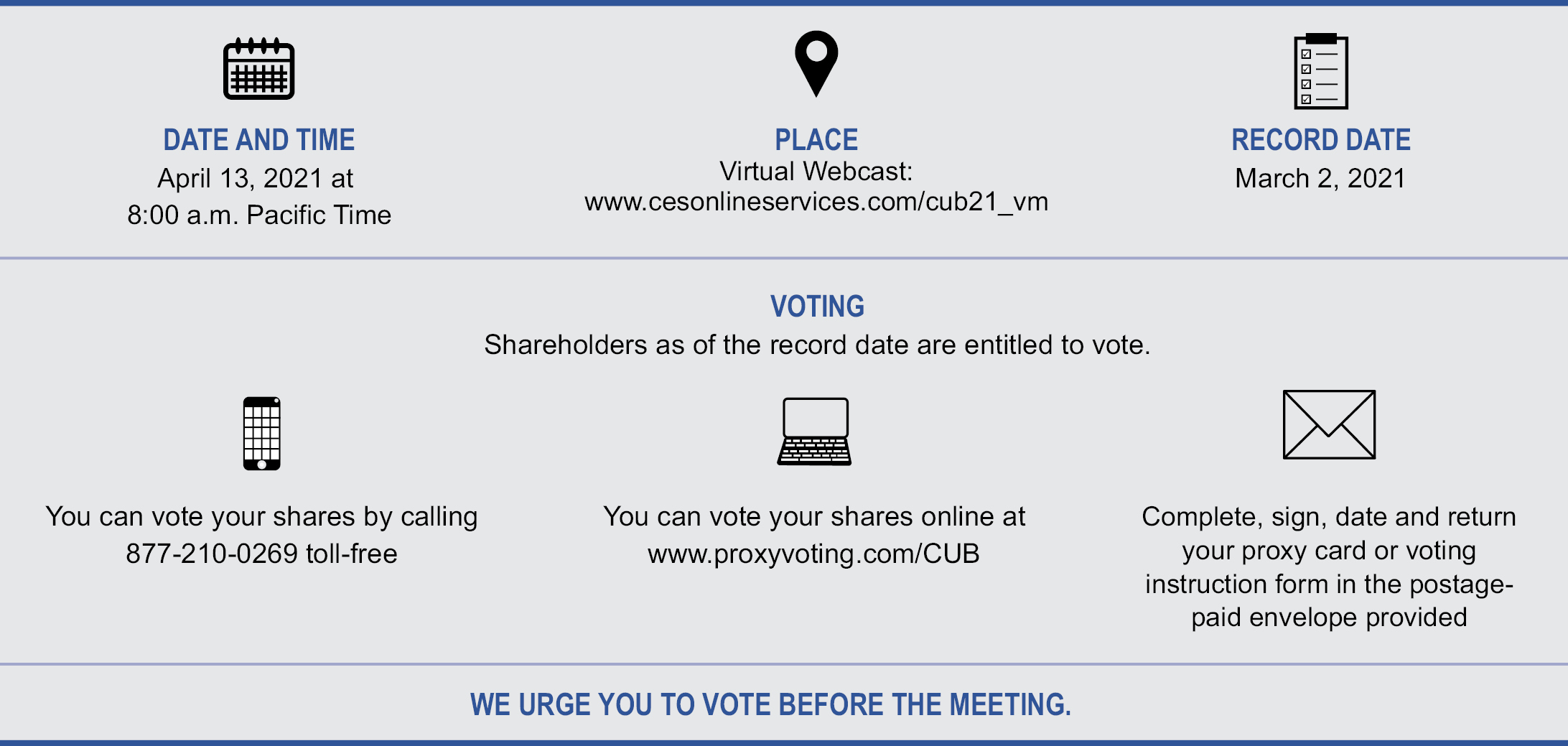 As part of our precautions regarding COVID-19, the 2021 Annual Meeting of Shareholders will be held virtually via a live webcast, at 8:00 a.m., Pacific Time, on Tuesday, April 13, 2021, at www.cesonlineservices.com/cub21_vm. To participate in the Annual Meeting, you must pre-register at www.cesonlineservices.com/cub21_vm by 8:00 a.m, Pacific Time, on Monday, April 12, 2021.