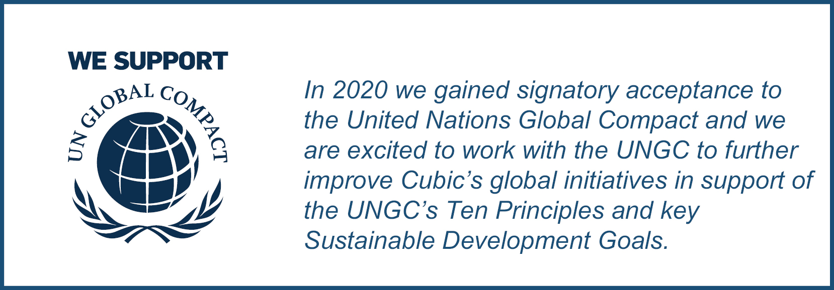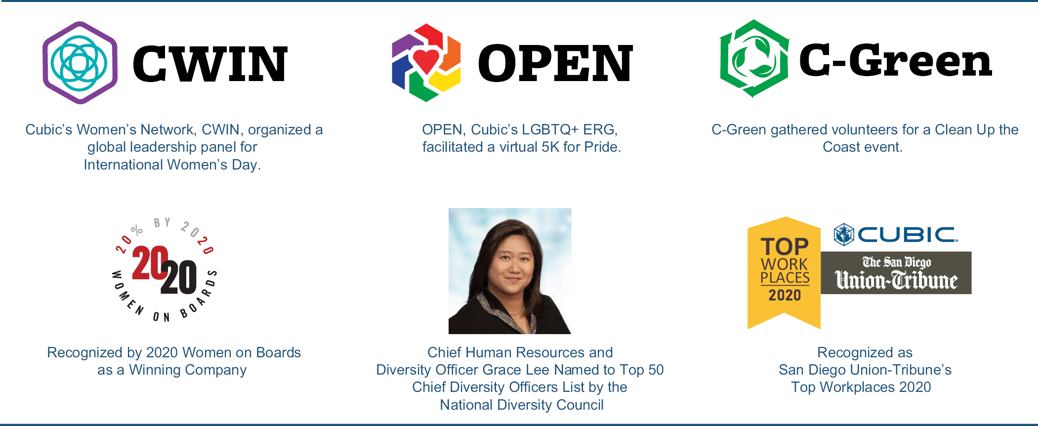 Cubic is committed to a globally inclusive workplace where everyone is respected, empowered and supported. We continue to deliver on our human resources strategic plan, including our Diversity and Inclusion strategy, which drives innovation across the organization with clear priorities related to recruiting diverse talent, expanding unconscious bias education, engaging an inclusive workforce, strengthening community outreach and supporting supplier diversity. Cubic is focused on improving employee health, productivity and overall engagement and our engagement score of 82% during the third quarter of 2020 — a company record — is a reflection of our progress and our unwavering focus on employee safety and well-being throughout the pandemic. Additionally, we are honored to be to be named as one of San Diego Union-Tribune’s Top Workplaces in 2020, which is a competitive, employee-nominated program.