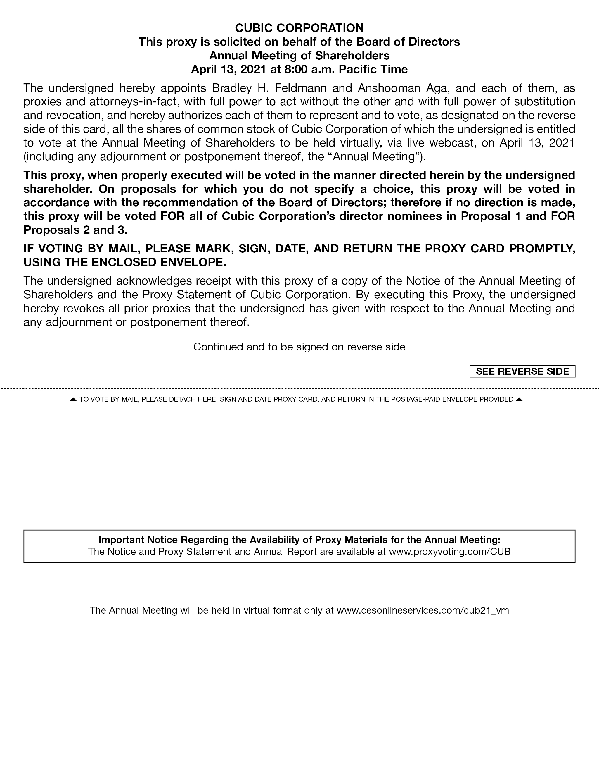 CUBIC CORPORATION This proxy is solicited on behalf of the Board of Directors Annual Meeting of Shareholders April 13, 2021 at 8:00 a.m. Pacific Time The undersigned hereby appoints Bradley H. Feldmann and Anshooman Aga, and each of them, as proxies and attorneys-in-fact, with full power to act without the other and with full power of substitution and revocation, and hereby authorizes each of them to represent and to vote, as designated on the reverse side of this card, all the shares of common stock of Cubic Corporation of which the undersigned is entitled to vote at the Annual Meeting of Shareholders to be held virtually, via live webcast, on April 13, 2021 (including any adjournment or postponement thereof, the “Annual Meeting”). This proxy, when properly executed will be voted in the manner directed herein by the undersigned shareholder. On proposals for which you do not specify a choice, this proxy will be voted in accordance with the recommendation of the Board of Directors; therefore if no direction is made, this proxy will be voted FOR all of Cubic Corporation’s director nominees in Proposal 1 and FOR Proposals 2 and 3. IF VOTING BY MAIL, PLEASE MARK, SIGN, DATE, AND RETURN THE PROXY CARD PROMPTLY, USING THE ENCLOSED ENVELOPE. The undersigned acknowledges receipt with this proxy of a copy of the Notice of the Annual Meeting of Shareholders and the Proxy Statement of Cubic Corporation. By executing this Proxy, the undersigned hereby revokes all prior proxies that the undersigned has given with respect to the Annual Meeting and any adjournment or postponement thereof. Continued and to be signed on reverse side SEE REVERSE SIDETO VOTE BY MAIL, PLEASE DETACH HERE, SIGN AND DATE PROXY CARD, AND RETURN IN THE POSTAGE-PAID ENVELOPE PROVIDED Important Notice Regarding the Availability of Proxy Materials for the Annual Meeting: The Notice and Proxy Statement and Annual Report are available at www.proxyvoting.com/CUB The Annual Meeting will be held in virtual format only at www.cesonlineservices.com/cub21_vm