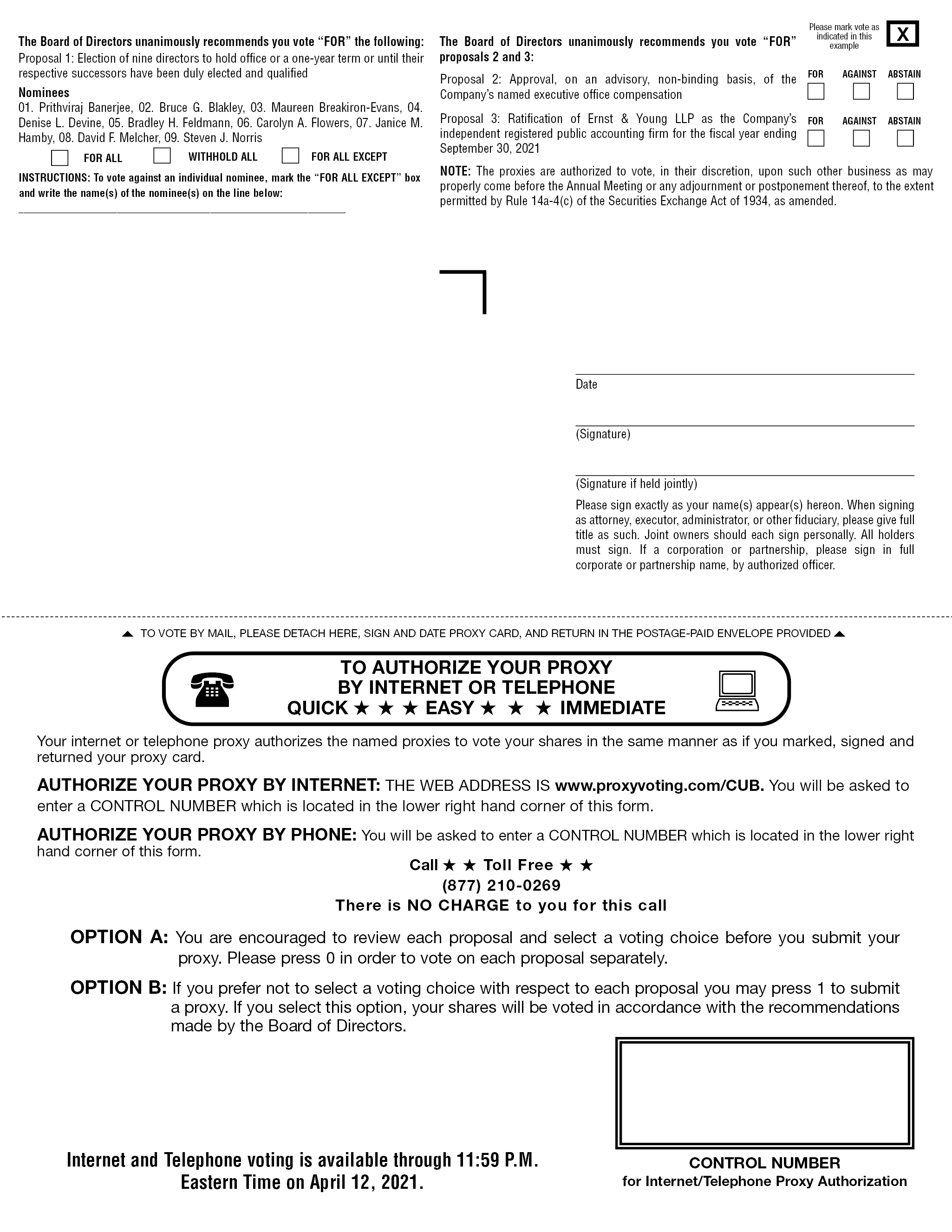 The Board of Directors unanimously recommends you vote “FOR” the following: Proposal 1: Election of nine directors to hold office or a one-year term or until their respective successors have been duly elected and qualified Nominees 01. Prithviraj Banerjee, 02. Bruce G. Blakley, 03. Maureen Breakiron-Evans, 04. Denise L. Devine, 05. Bradley H. Feldmann, 06. Carolyn A. Flowers, 07. Janice M. Hamby, 08. David F. Melcher, 09. Steven J. Norris FOR ALL WITHHOLD ALLFOR ALL EXCEPT INSTRUCTIONS: To vote against an individual nominee, mark the “FOR ALL EXCEPT” box and write the name(s) of the nominee(s) on the line below: The Board of Directors unanimously recommends you vote “FOR” proposals 2 and 3: Please mark vote as indicated in this example Proposal 2: Approval, on an advisory, non-binding basis, of the Company’s named executive office compensation Proposal 3: Ratification of Ernst & Young LLP as the Company’s independent registered public accounting firm for the fiscal year ending September 30, 2021 NOTE: The proxies are authorized to vote, in their discretion, upon such other business as may properly come before the Annual Meeting or any adjournment or postponement thereof, to the extent permitted by Rule 14a-4(c) of the Securities Exchange Act of 1934, as amended. Date (Signature) (Signature if held jointly) Please sign exactly as your name(s) appear(s) hereon. When signing as attorney, executor, administrator, or other fiduciary, please give full title as such. Joint owners should each sign personally. All holders must sign. If a corporation or partnership, please sign in full corporate or partnership name, by authorized officer. TO VOTE BY MAIL, PLEASE DETACH HERE, SIGN AND DATE PROXY CARD, AND RETURN IN THE POSTAGE-PAID ENVELOPE PROVIDED TO AUTHORIZE YOUR PROXY BY INTERNET OR TELEPHONE QUICK EASY IMMEDIATE Your internet or telephone proxy authorizes the named proxies to vote your shares in the same manner as if you marked, signed and returned your proxy card. AUTHORIZE YOUR PROXY BY INTERNET: THE WEB ADDRESS IS ww.proxyvoting.com/CUB. You will be asked to enter a CONTROL NUMBER which is located in the lower right hand corner of this form. AUTHORIZE YOUR PROXY BY PHONE: You will be asked to enter a CONTROL NUMBER which is located in the lower right hand corner of this form. OPTION A: You are encouraged to review each proposal and select a voting choice before you submit your proxy. Please press 0 in order to vote on each proposal separately. OPTION B: If you prefer not to select a voting choice with respect to each proposal you may press 1 to submit a proxy. If you select this option, your shares will be voted in accordance with the recommendations made by the Board of Directors. Internet and Telephone voting is available through 11:59 P.M.Eastern Time on April 12, 2021. CONTROL NUMBER for Internet/Telephone Proxy Authorization