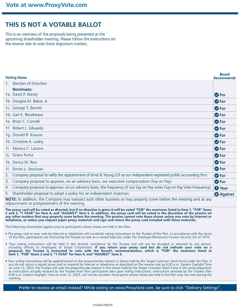 You may vote if you held shares of Target common stock as of the record date (April 17, 2023). You are able to vote your shares by providing instructions to the proxy holders who will then vote in accordance with your instructions. We urge you to read the 2023 Proxy Statement carefully and to vote in accordance with the recommendations of the Board.