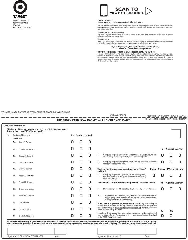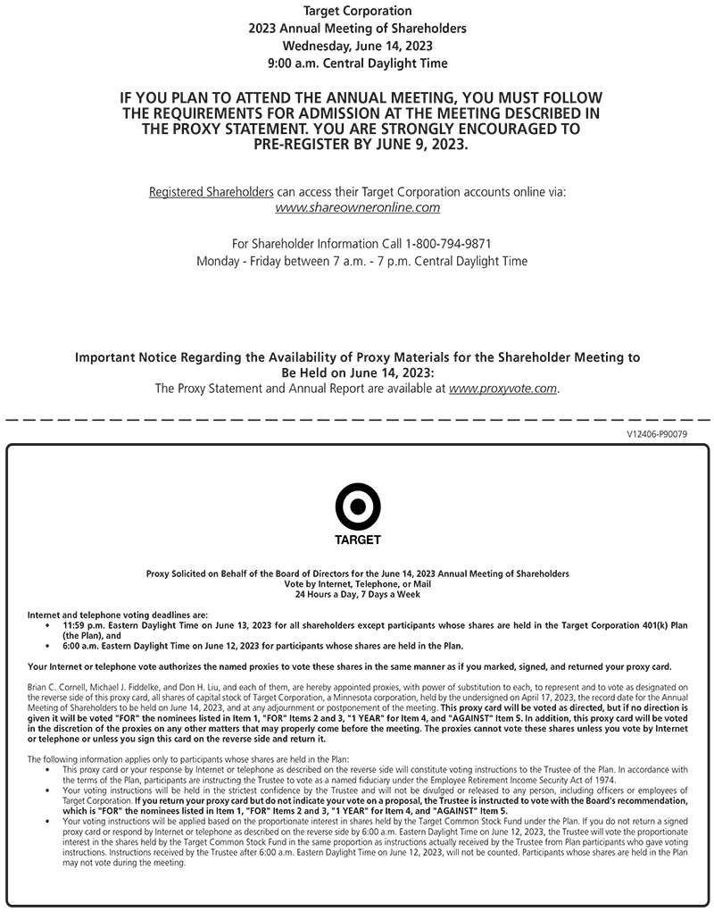 | Deadline | • Registered Shareholders or Beneficial Owners — 11:59 p.m. Eastern Daylight Time on June 13, 2023. • Participants in the Target 401(k) Plan — 6:00 a.m. Eastern Daylight Time on June 12, 2023. | ||