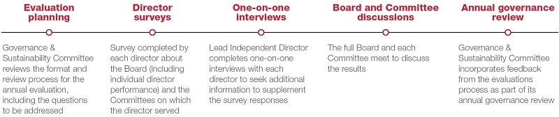 | Board evaluations and refreshment | The Board regularly evaluates its performance in a variety of ways. Those evaluations, changes in business strategy and operations, and anticipated director retirements are considered by the Governance & Sustainability Committee in determining desired skills for future Board members to supplement the general Board membership criteria in our Corporate Governance Guidelines. | |