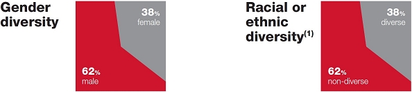 | Diversity | The composition of our Board represents broad perspectives, experiences, and knowledge relevant to our business while maintaining a balanced approach to gender and ethnic diversity. In addition, the Board’s policy is to include candidates that identify as members of historically underrepresented groups in the pool of potential director candidates to be considered by the Governance & Sustainability Committee. | |