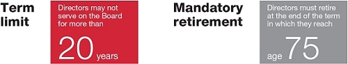 | Director tenure policies | Our director tenure policies include mandatory retirement at age 75 and a maximum term limit of 20 years. These policies encourage Board refreshment and provide additional opportunities to maintain a balanced mix of perspectives and experiences. | 22 | ||
