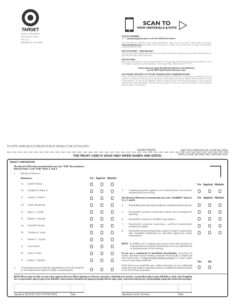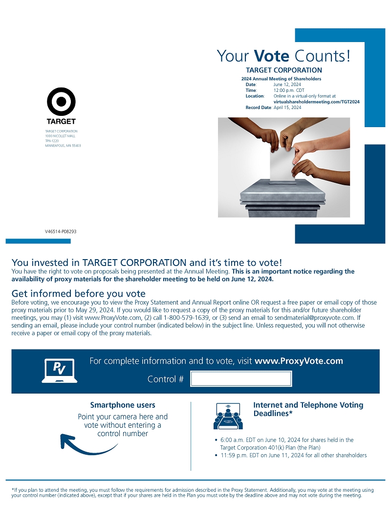 You may vote if you held shares of Target common stock as of the record date (April 15, 2024). You are able to vote your shares by providing instructions to the proxy holders who will then vote in accordance with your instructions. We urge you to read the 2024 Proxy Statement carefully and to vote in accordance with the recommendations of the Board.