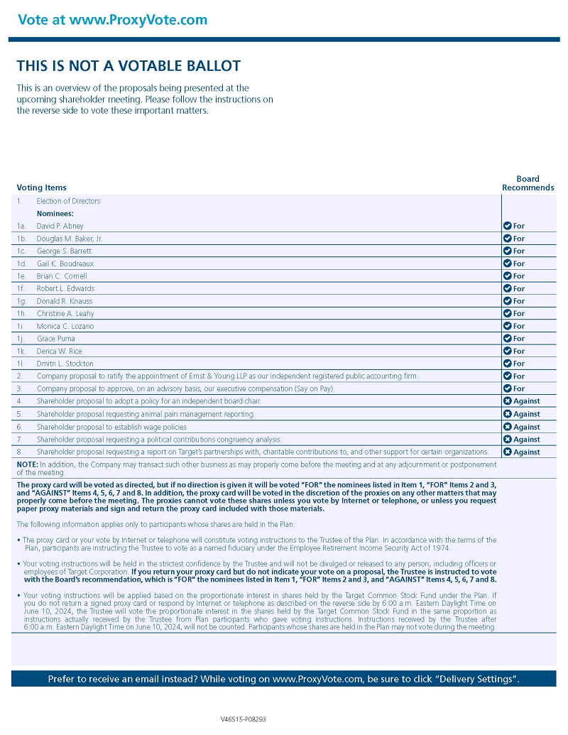 | Deadline | • Registered Shareholders or Beneficial Owners — 11:59 p.m. Eastern Daylight Time on June 11, 2024. • Participants in the Target 401(k) Plan — 6:00 a.m. Eastern Daylight Time on June 10, 2024. | ||