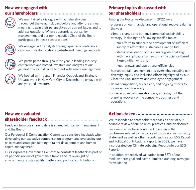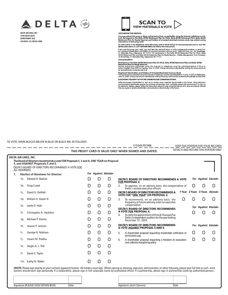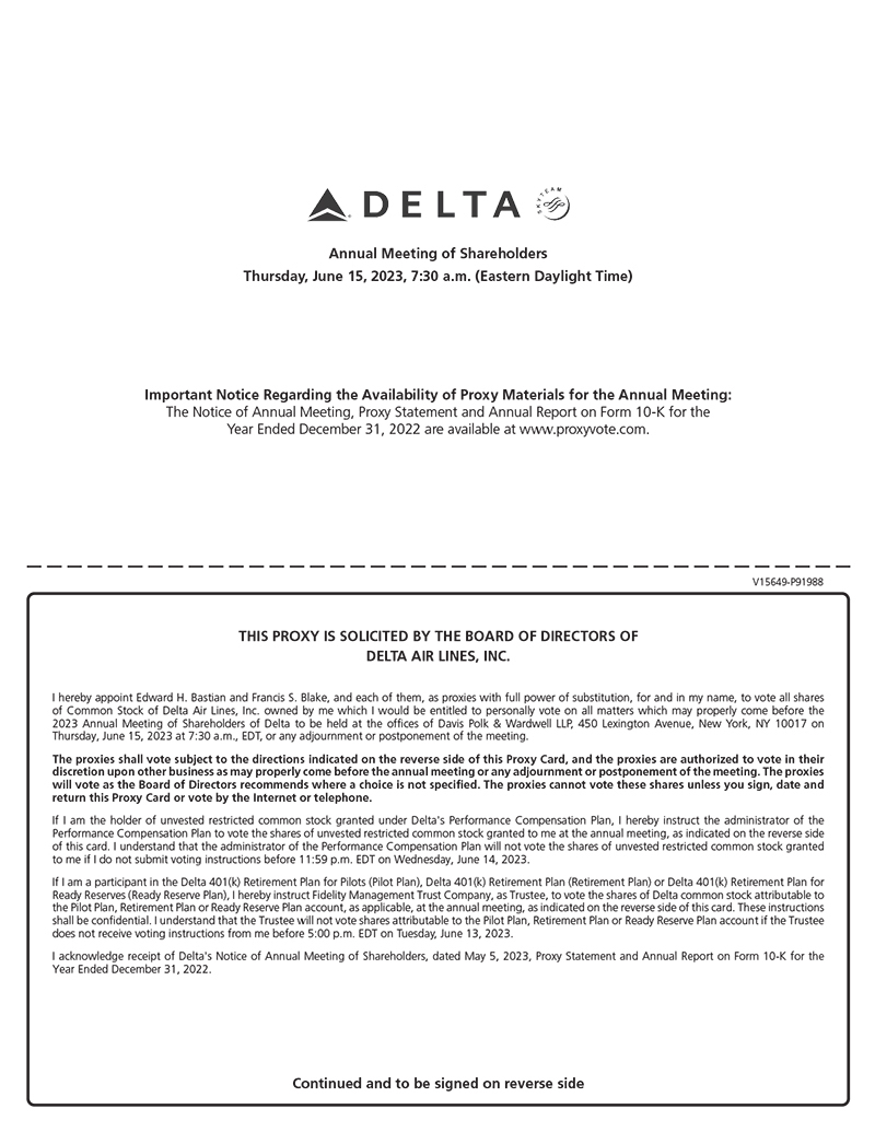 Looking forward to the second half of 2023 and Delta’s continuing climb, we encourage your ongoing engagement with us on the issues of importance to you at Delta. We welcome your suggestions and concerns. Most especially, we appreciate you taking time to participate in our annual meeting by submitting your votes for the ballot items described in this proxy statement.