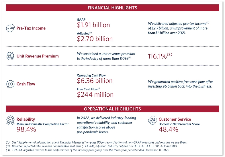 Restoring our financial performance. Delta led the industry in profitability in 2022, accounting for half of the industry’s adjusted pre-tax earnings while operating 20 percent of U.S. industry capacity. Our commercial strategy continues to deliver results, with a growing mix of premium products, record co-brand results and continued revenue diversification. We generated positive free cash flow for the year and continue to pay down debt and strengthen our balance sheet, bringing us towards our goal of investment-grade metrics.