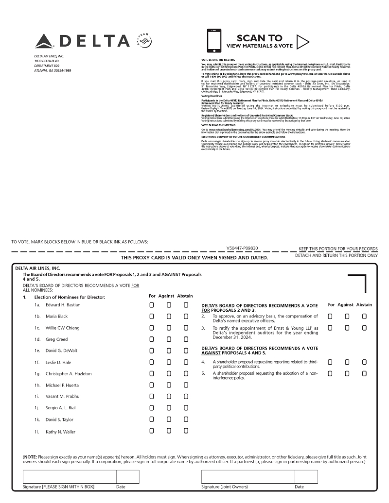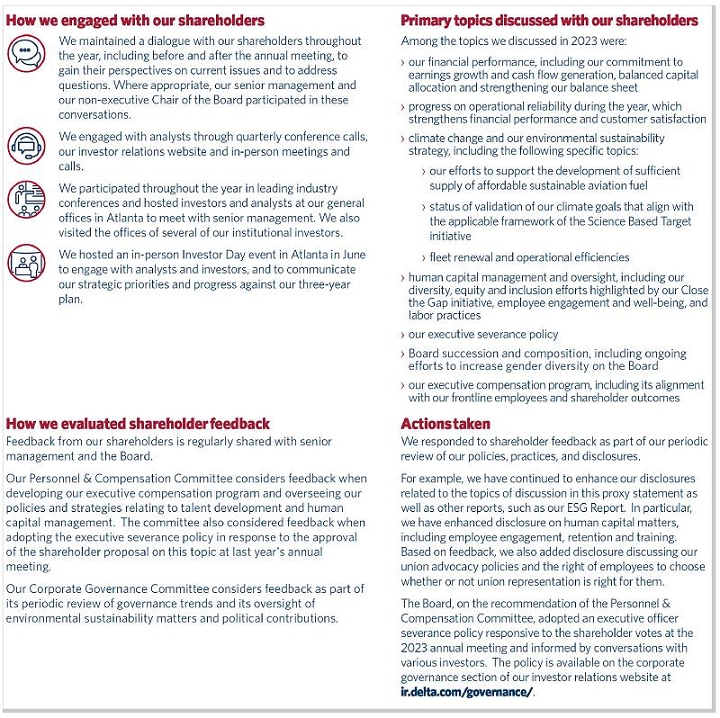 As I look forward to my first annual meeting with you as Chair of Delta’s Board, it has been a pleasure to interact with investors since assuming this role last summer. I have enjoyed discussing a wide range of topics. As relayed in these conversations, our Board is active and keenly focused on: