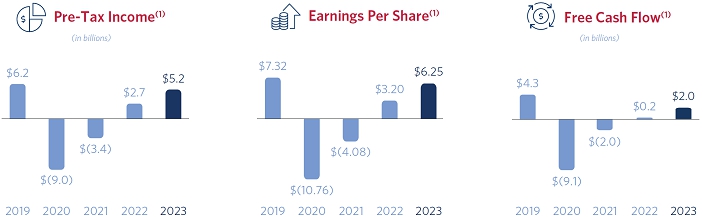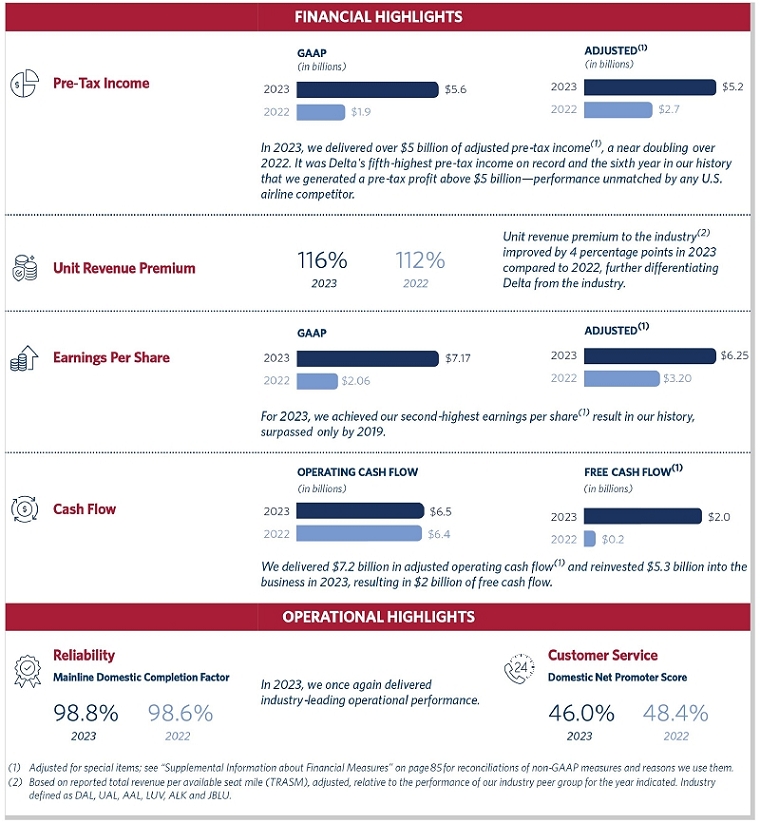 Strengthening our financial foundation. The team’s outstanding work generated $5.2 billion in adjusted pre-tax profit in 2023, nearly doubling our prior year results. Just as important, Delta delivered free cash flow of $2 billion (while investing $5.3 billion in the business) and repaid $4 billion of debt and finance lease obligations. Delta delivered 40% of the industry’s overall profits despite operating only 20% of the market share.