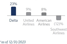 Delivering operational excellence at full scale. Operational reliability is the core of our brand promise. Against a difficult operating environment, our people delivered the best fourth-quarter operating performance in Delta’s history. Cirium honored Delta for the third consecutive year with the Cirium Platinum Award for global operational excellence and the Wall Street Journal named us the top airline of 2023 among the nine major U.S. airlines in its annual airline scorecard for the third consecutive year.