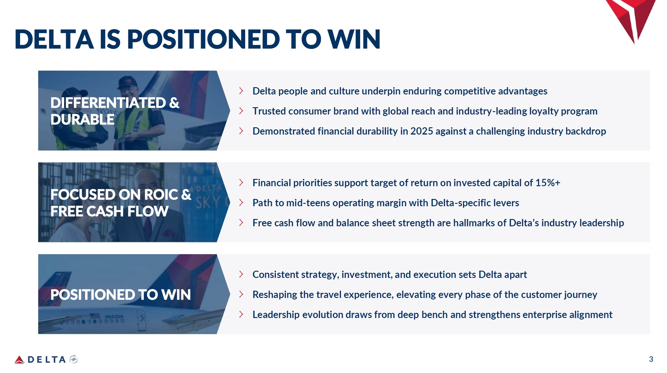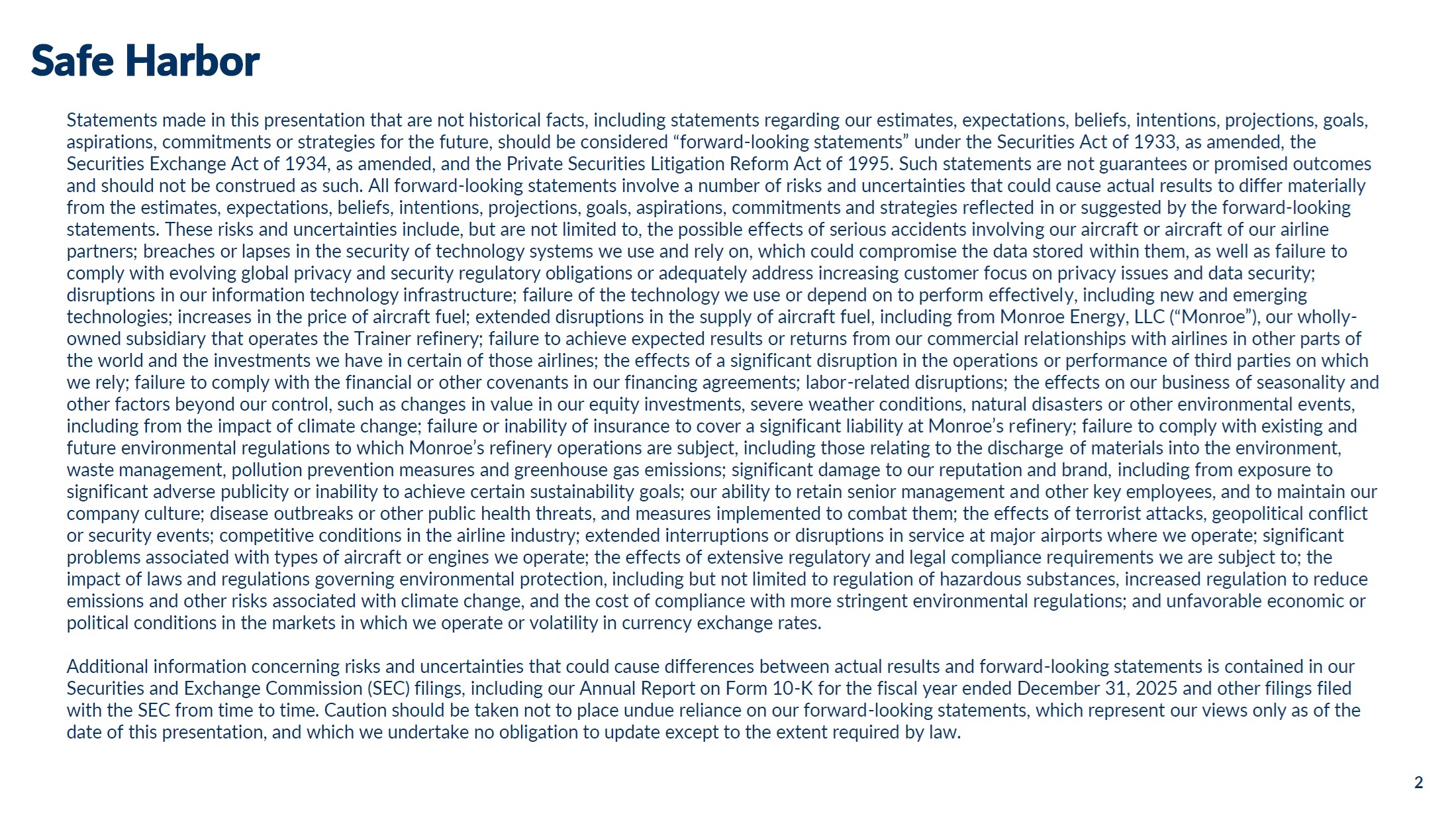 Statements made in this presentation that are not historical facts, including statements regarding our estimates, expectations, beliefs, intentions, projections, goals, aspirations, commitments or strategies for the future, should be considered “forward - looking statements” under the Securities Act of 1933, as amended, the Securities Exchange Act of 1934, as amended, and the Private Securities Litigation Reform Act of 1995. Such statements are not guarantees or promised outcomes and should not be construed as such. All forward - looking statements involve a number of risks and uncertainties that could cause actual results to differ materially from the estimates, expectations, beliefs, intentions, projections, goals, aspirations, commitments and strategies reflected in or suggested by the forward - looking statements. These risks and uncertainties include, but are not limited to, the possible effects of serious accidents involving our aircraft or aircraft of our airline partners; breaches or lapses in the security of technology systems we use and rely on, which could compromise the data stored within them, as well as failure to comply with evolving global privacy and security regulatory obligations or adequately address increasing customer focus on privacy issues and data security; disruptions in our information technology infrastructure; failure of the technology we use or depend on to perform effectively, including new and emerging technologies; increases in the price of aircraft fuel; extended disruptions in the supply of aircraft fuel, including from Monroe Energy, LLC (“Monroe”), our wholly - owned subsidiary that operates the Trainer refinery; failure to achieve expected results or returns from our commercial relationships with airlines in other parts of the world and the investments we have in certain of those airlines; the effects of a significant disruption in the operations or performance of third parties on which we rely; failure to comply with the financial or other covenants in our financing agreements; labor - related disruptions; the effects on our business of seasonality and other factors beyond our control, such as changes in value in our equity investments, severe weather conditions, natural disasters or other environmental events, including from the impact of climate change; failure or inability of insurance to cover a significant liability at Monroe’s refinery; failure to comply with existing and future environmental regulations to which Monroe’s refinery operations are subject, including those relating to the discharge of materials into the environment, waste management, pollution prevention measures and greenhouse gas emissions; significant damage to our reputation and brand, including from exposure to significant adverse publicity or inability to achieve certain sustainability goals; our ability to retain senior management and other key employees, and to maintain our company culture; disease outbreaks or other public health threats, and measures implemented to combat them; the effects of terrorist attacks, geopolitical conflict or security events; competitive conditions in the airline industry; extended interruptions or disruptions in service at major airports where we operate; significant problems associated with types of aircraft or engines we operate; the effects of extensive regulatory and legal compliance requirements we are subject to; the impact of laws and regulations governing environmental protection, including but not limited to regulation of hazardous substances, increased regulation to reduce emissions and other risks associated with climate change, and the cost of compliance with more stringent environmental regulations; and unfavorable economic or political conditions in the markets in which we operate or volatility in currency exchange rates. Additional information concerning risks and uncertainties that could cause differences between actual results and forward - looking statements is contained in our Securities and Exchange Commission (SEC) filings, including our Annual Report on Form 10 - K for the fiscal year ended December 31, 2025 and other filings filed with the SEC from time to time. Caution should be taken not to place undue reliance on our forward - looking statements, which represent our views only as of the date of this presentation, and which we undertake no obligation to update except to the extent required by law. 2 Safe Harbor