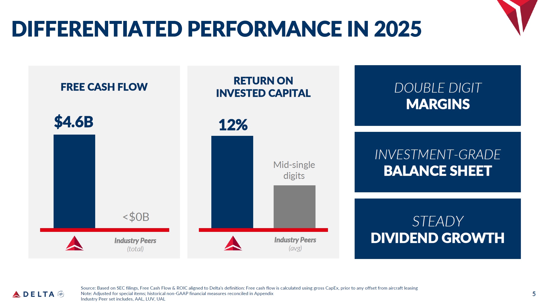 3 Consistent strategy, investment, and execution sets Delta apart Reshaping the travel experience, elevating every phase of the customer journey Leadership evolution draws from deep bench and strengthens enterprise alignment Financial priorities support target of return on invested capital of 15%+ Path to mid - teens operating margin with Delta - specific levers Free cash flow and balance sheet strength are hallmarks of Delta’s industry leadership Delta people and culture underpin enduring competitive advantages Trusted consumer brand with global reach and industry - leading loyalty program Demonstrated financial durability in 2025 against a challenging industry backdrop DELTA IS POSITIONED TO WIN